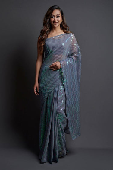 Grey Color Sequins Work Georgette Fabric Party Wear Stunning Saree