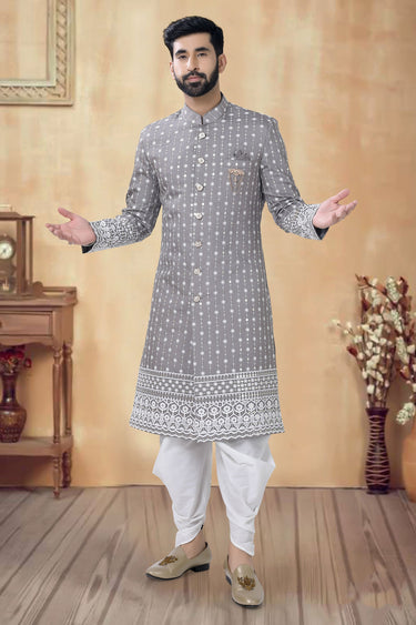 Grey Color Silk Fabric Wedding Wear Readymade Indo Western