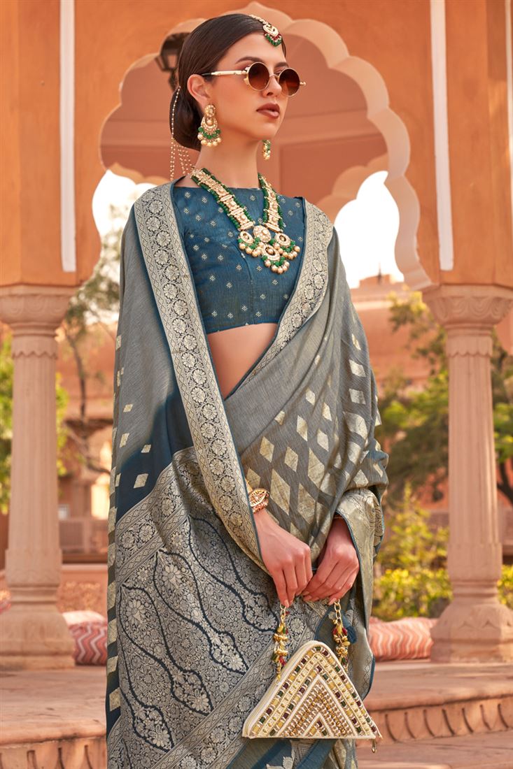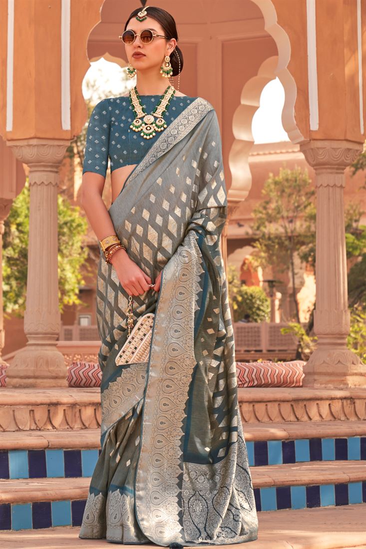 Grey Color Stunning Kachhi Silk Saree With Weaving Work