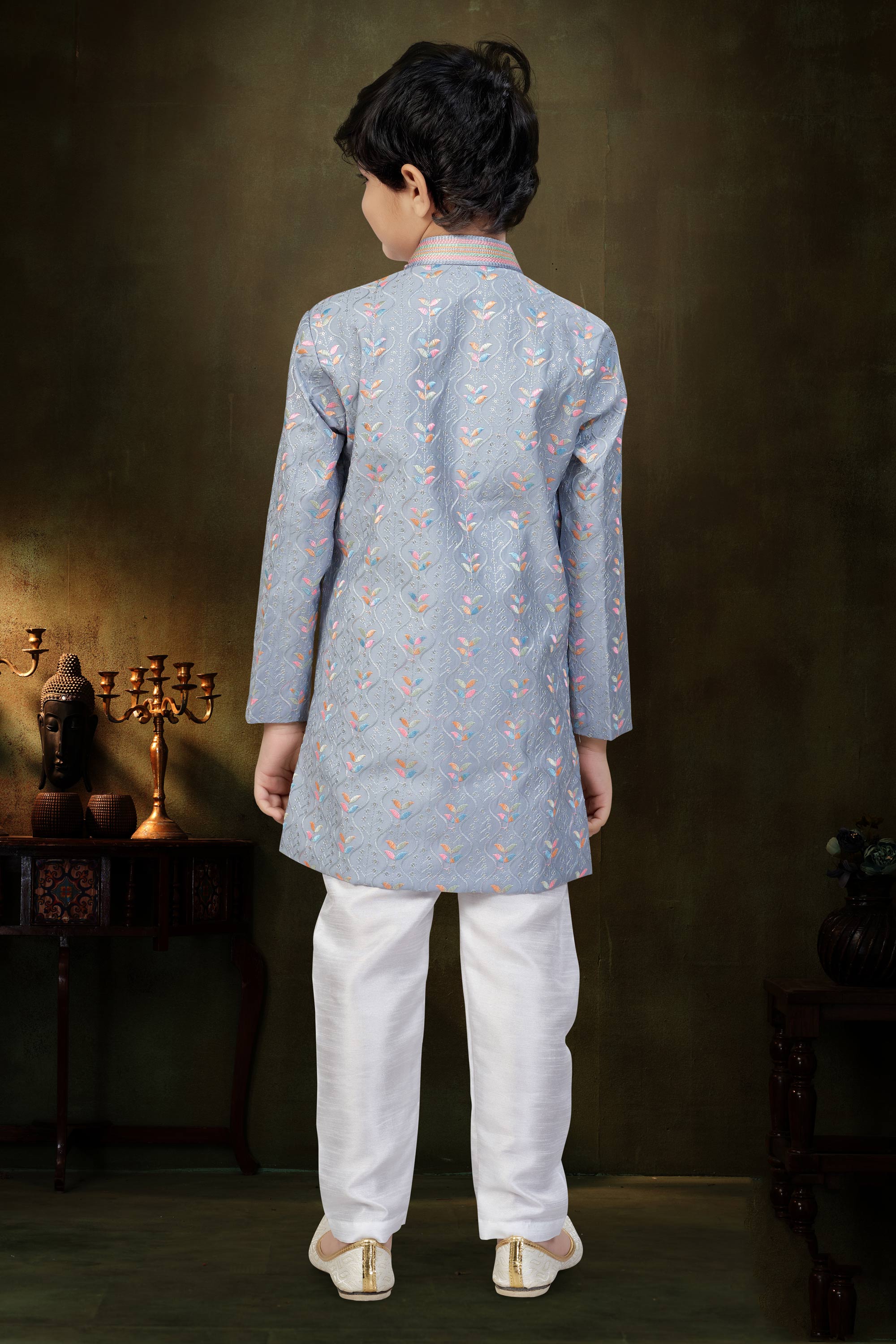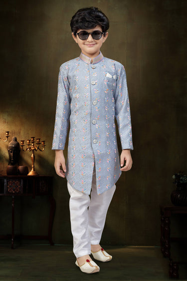 Grey Festive Wear Jacquard Fabric Readymade Indo Western For Boys