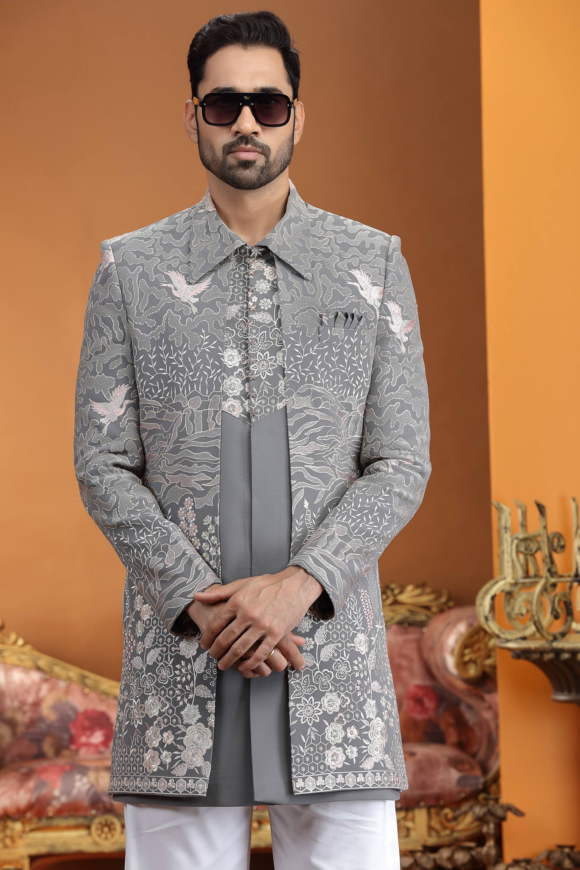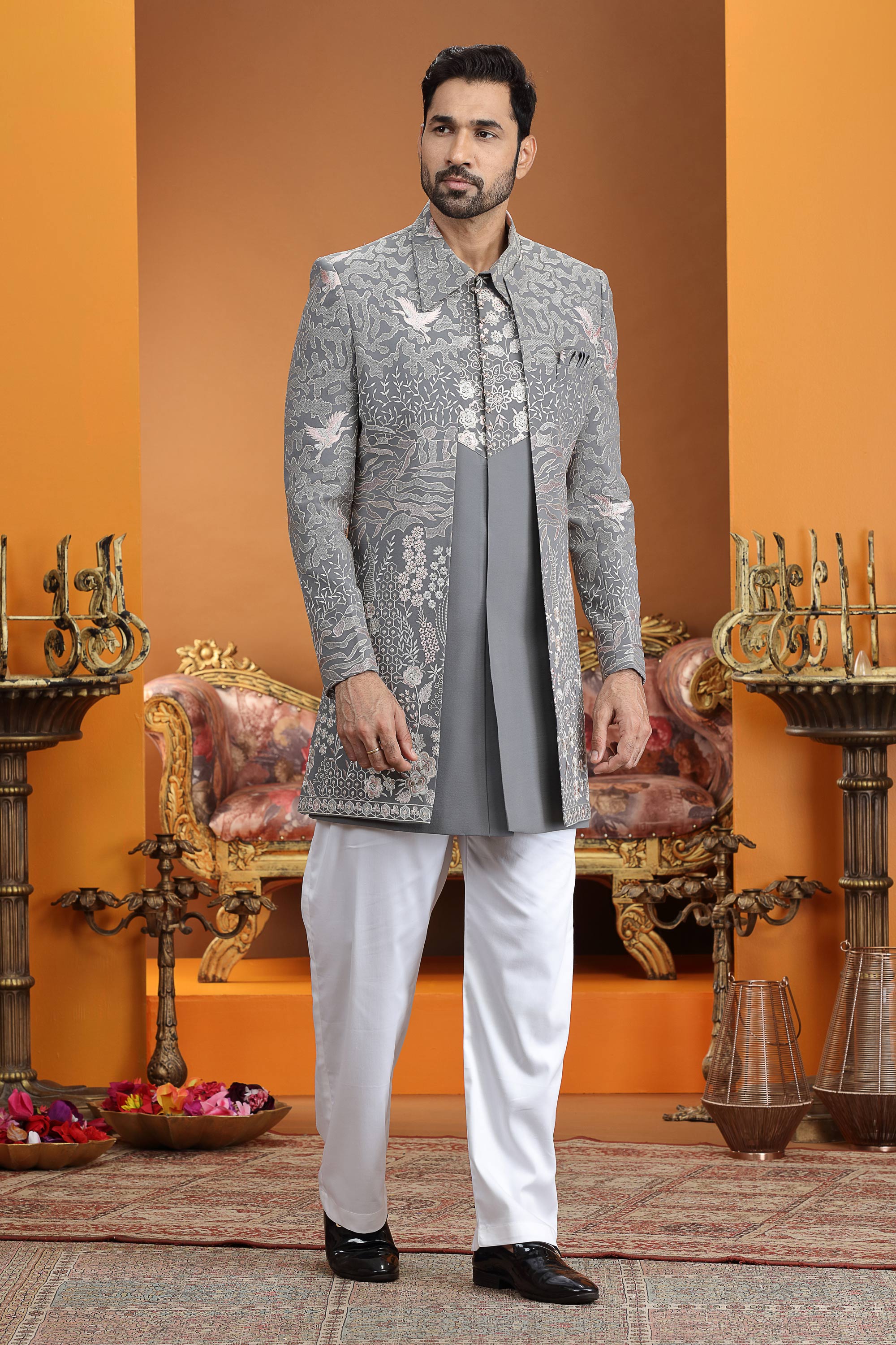 Grey Wedding Wear Art Silk 3 Piece Indo Western For Men