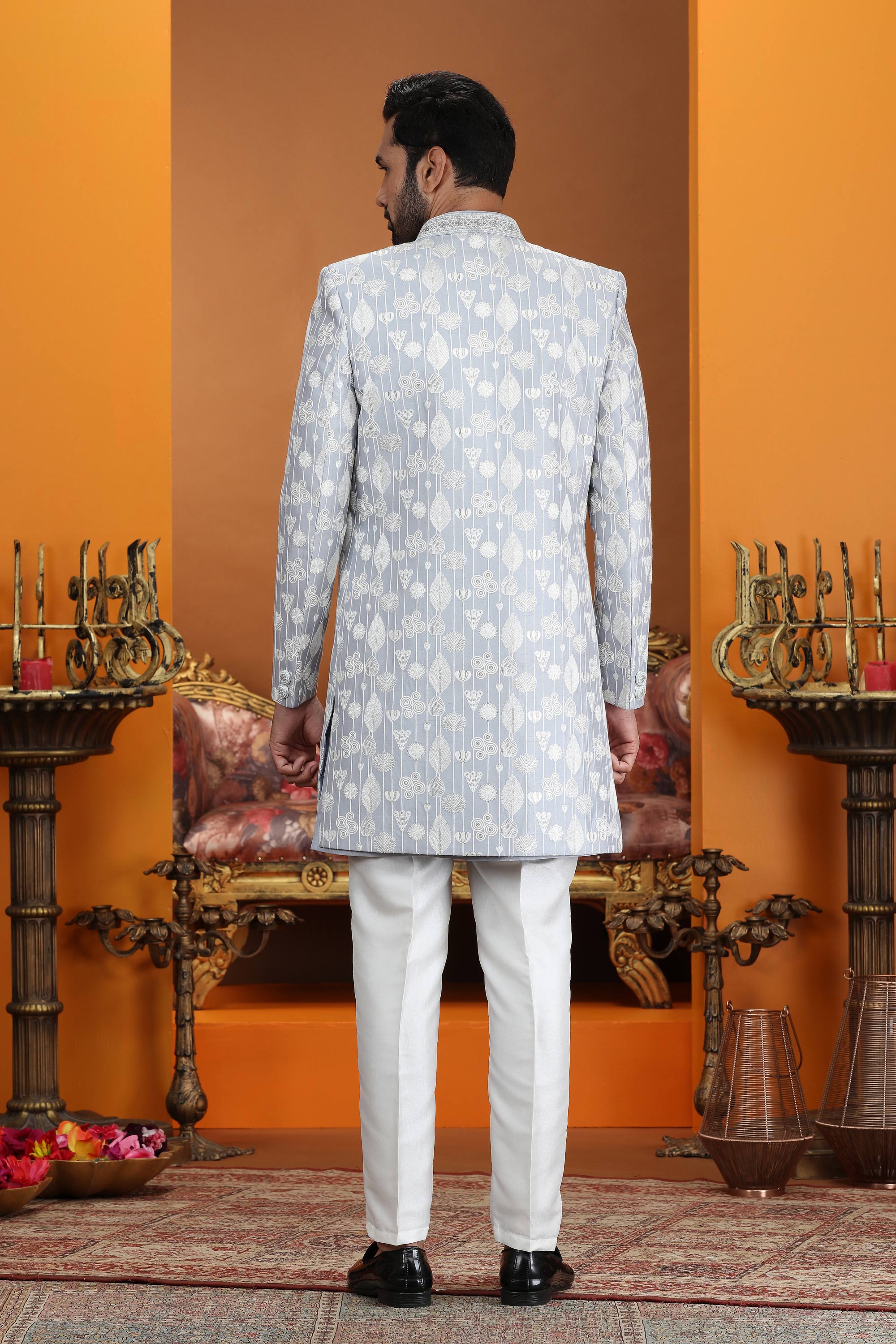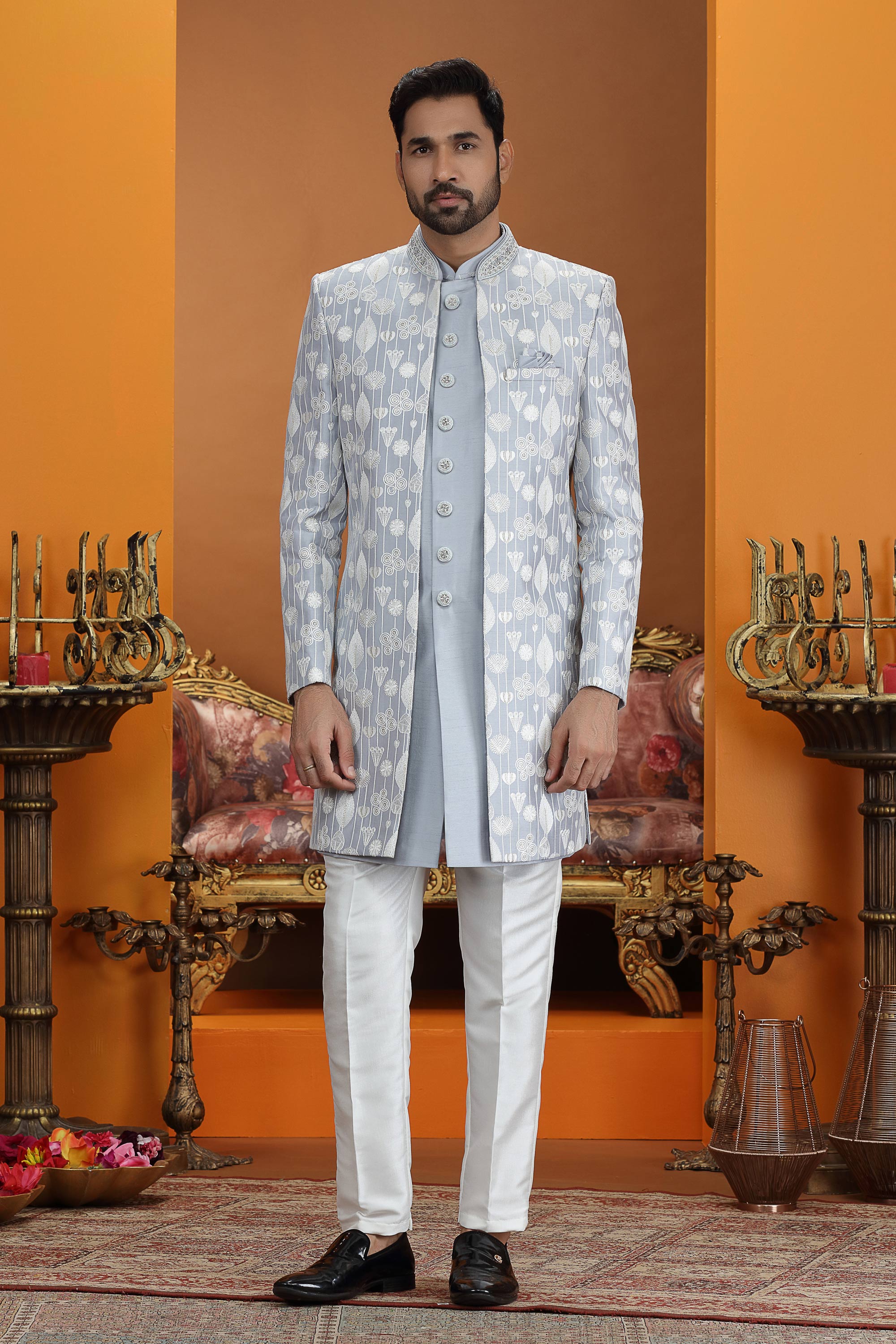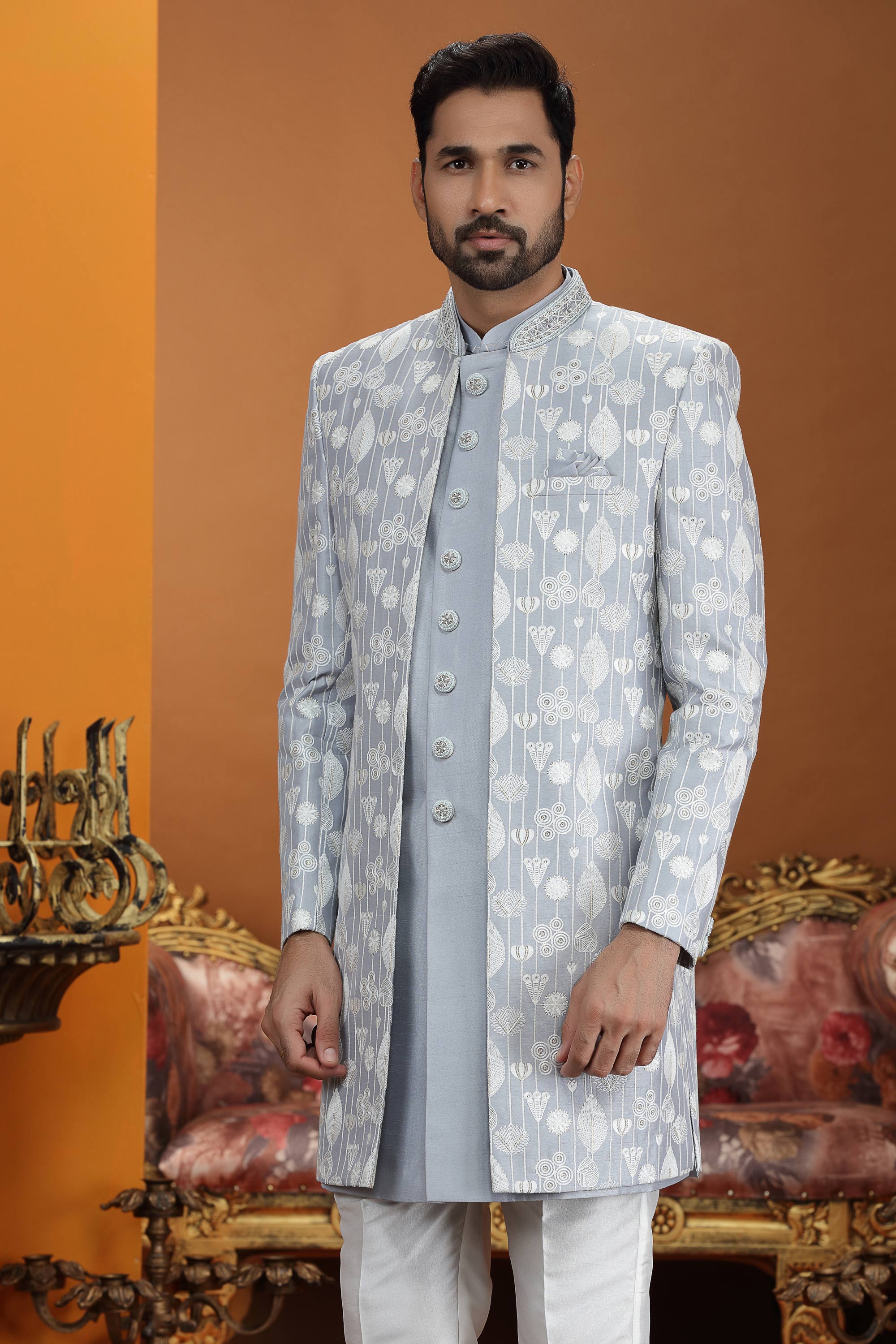 Grey Wedding Wear Art Silk Fabric Readymade Indo Western