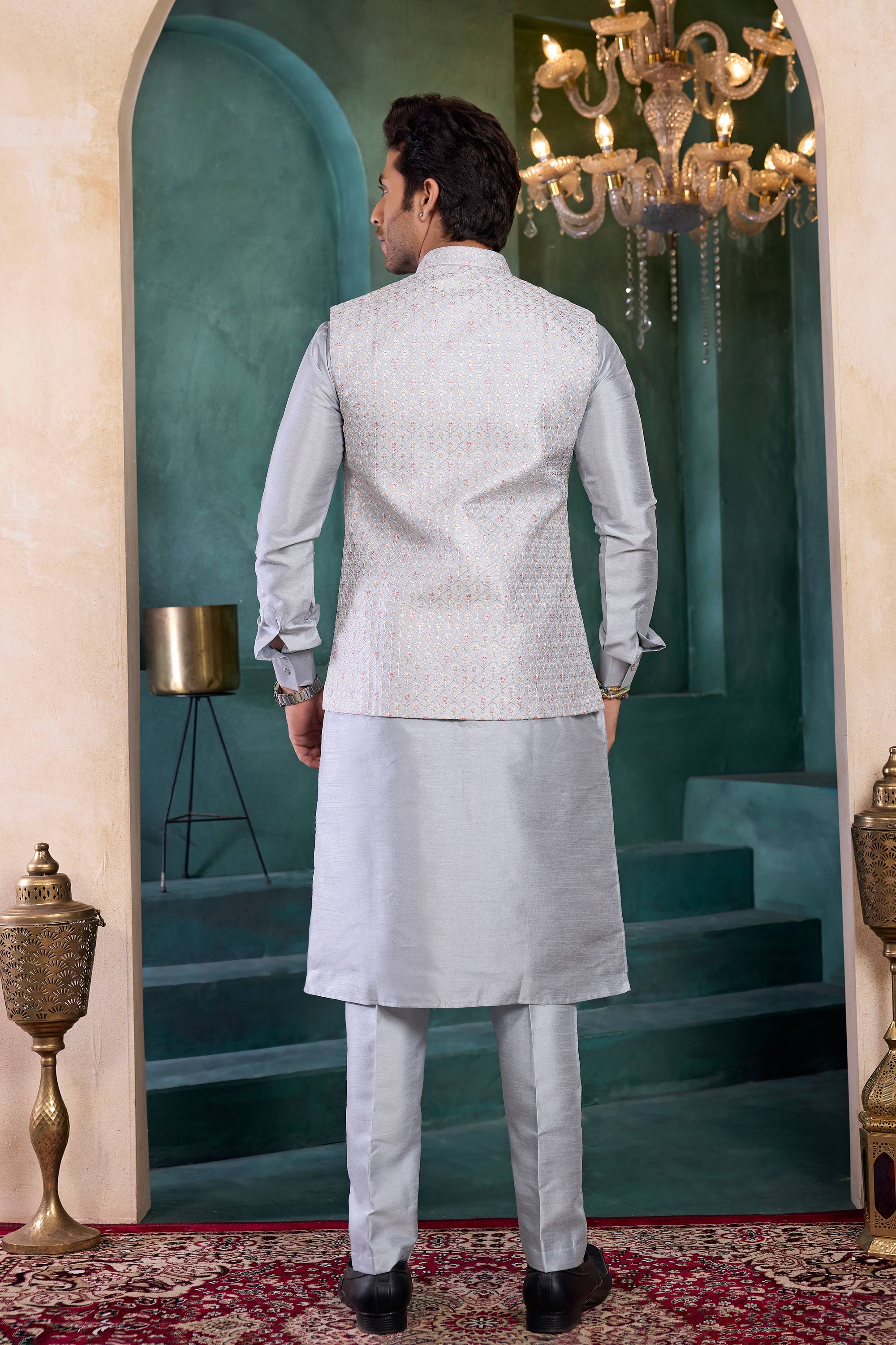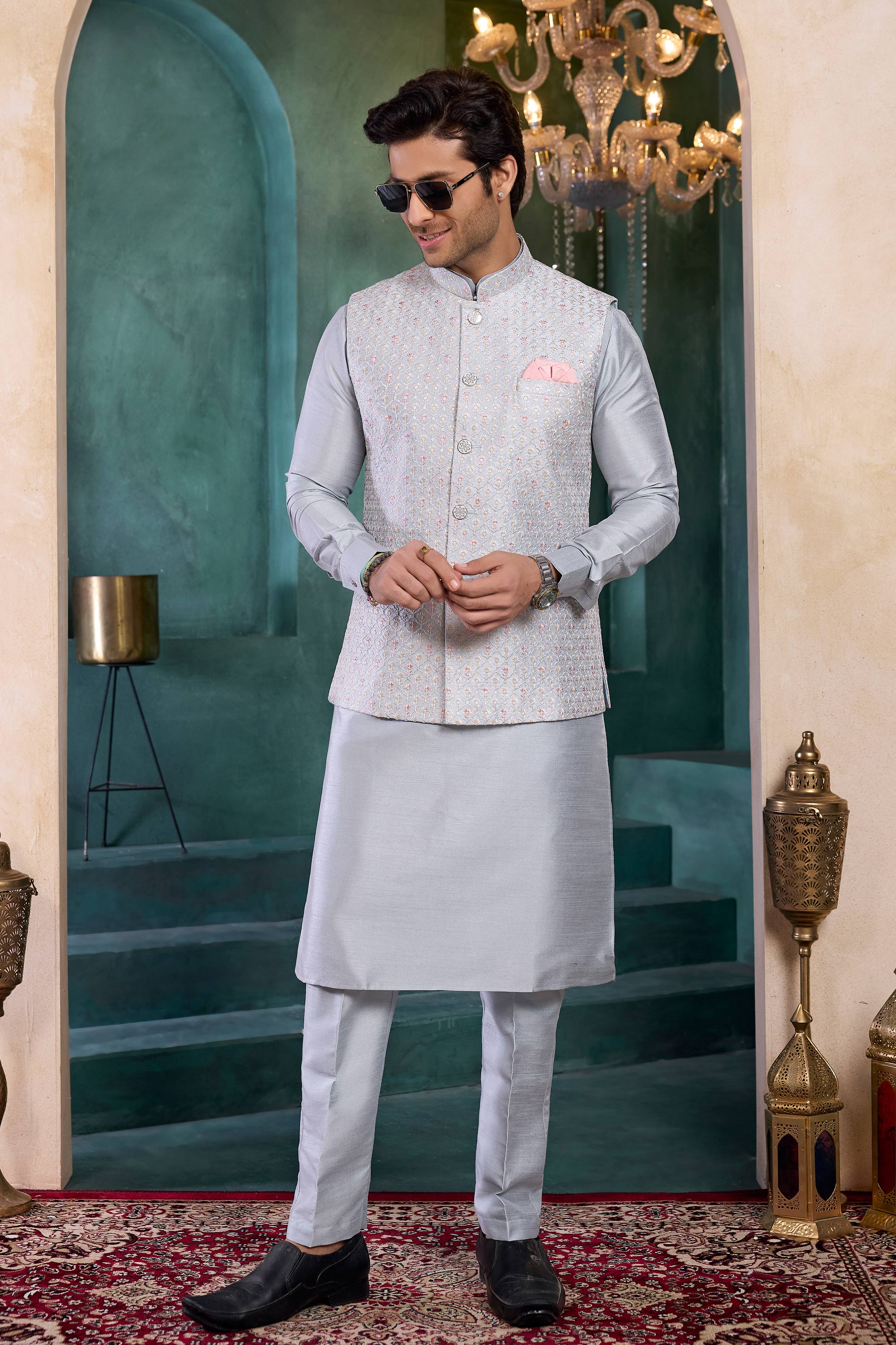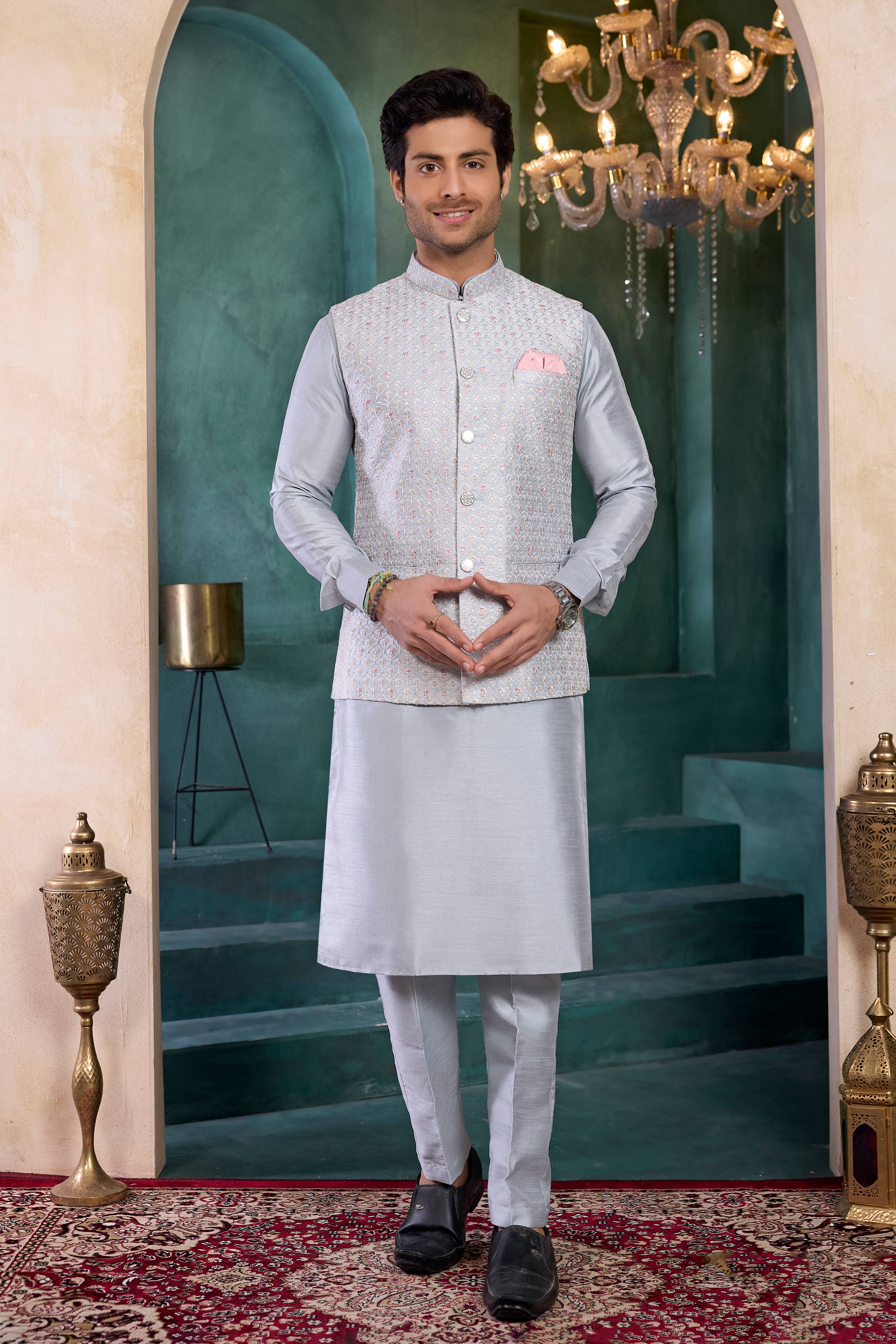 Grey Wedding Wear Art Silk Readymade Kurta And Aligadhi Pant For Men