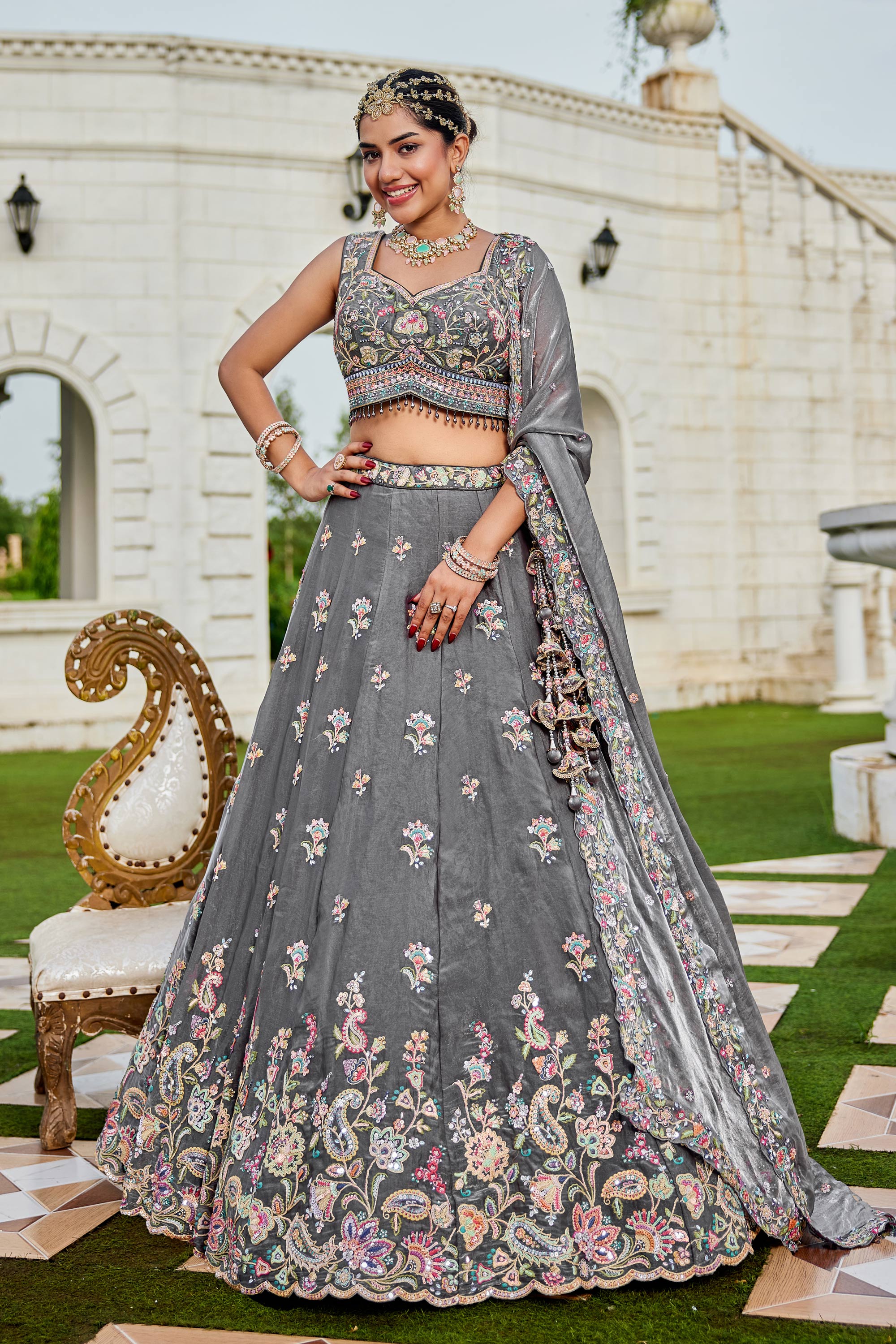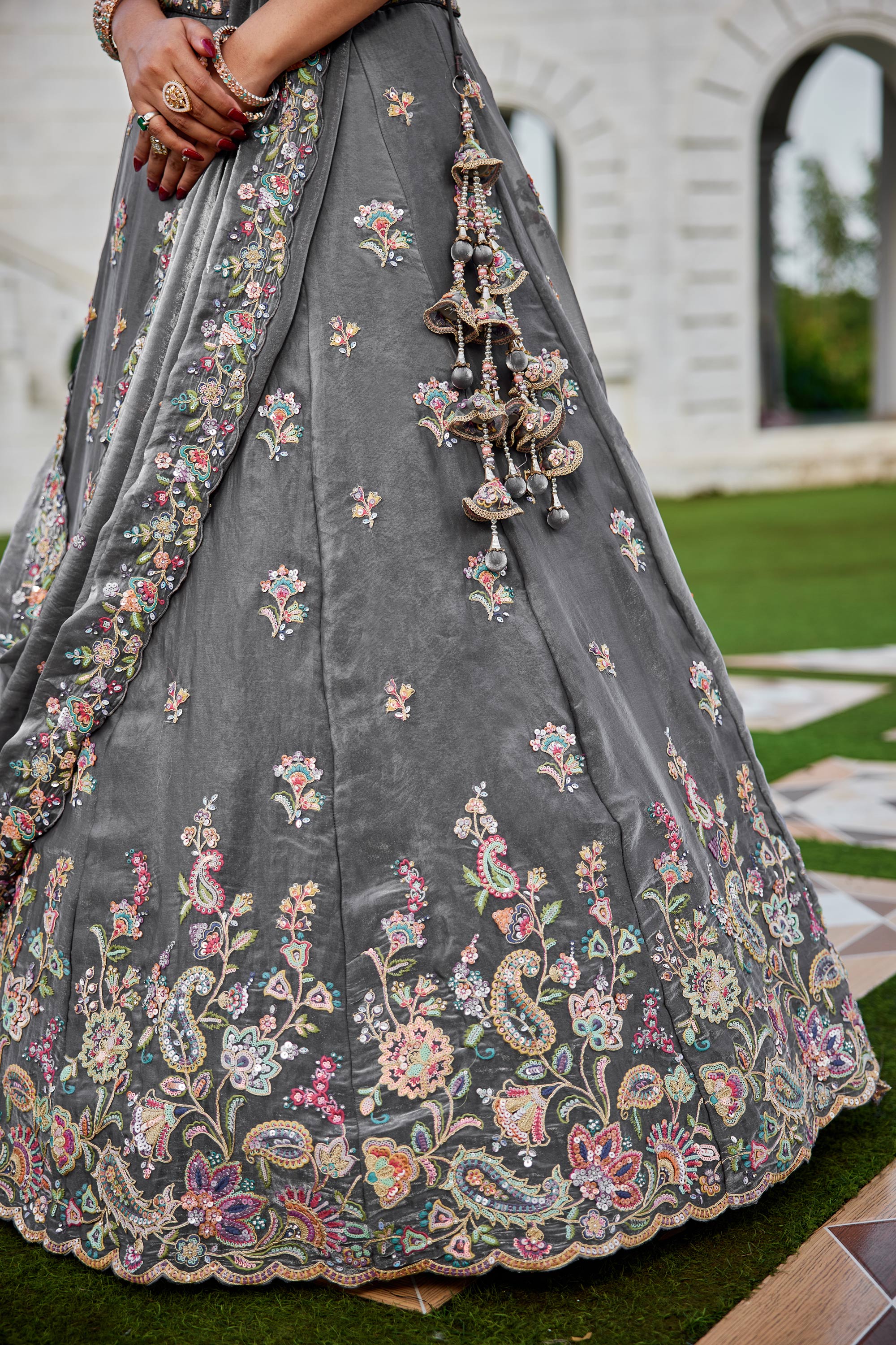 Grey Wedding Wear Tissue Embroidered Lehenga Choli With Dupatta