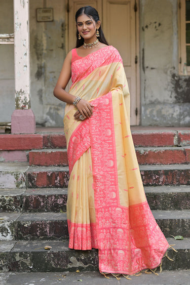 Explore the exquisite beauty of our Adorable Beige Color Casual Handloom Raw Silk Woven Border Design Saree. This sartorial elegance features a Handloom Raw Silk saree and blouse, ensuring durability and class. Highlighting contrast woven border with intricate butti weaves. Comes with a standard 5.5-meter saree length and 0.8-meter blouse piece. Maintain its royal shine and texture with simple dry cleaning. Note that there could be a minor variation in the color due to photographic effects. Be ready to win compliments, as this product is ready to ship.