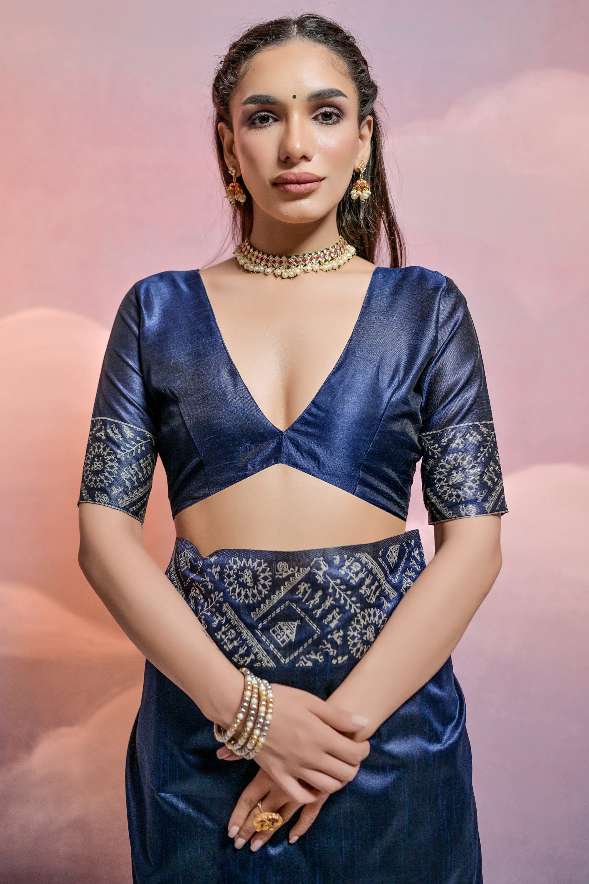 Handloom Raw Silk Navy Blue Color Weaving Border Work Saree
