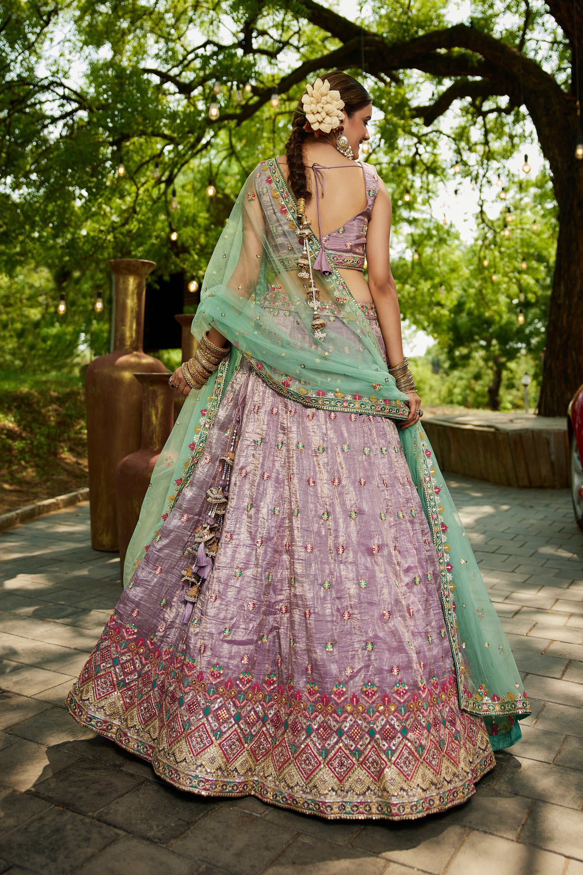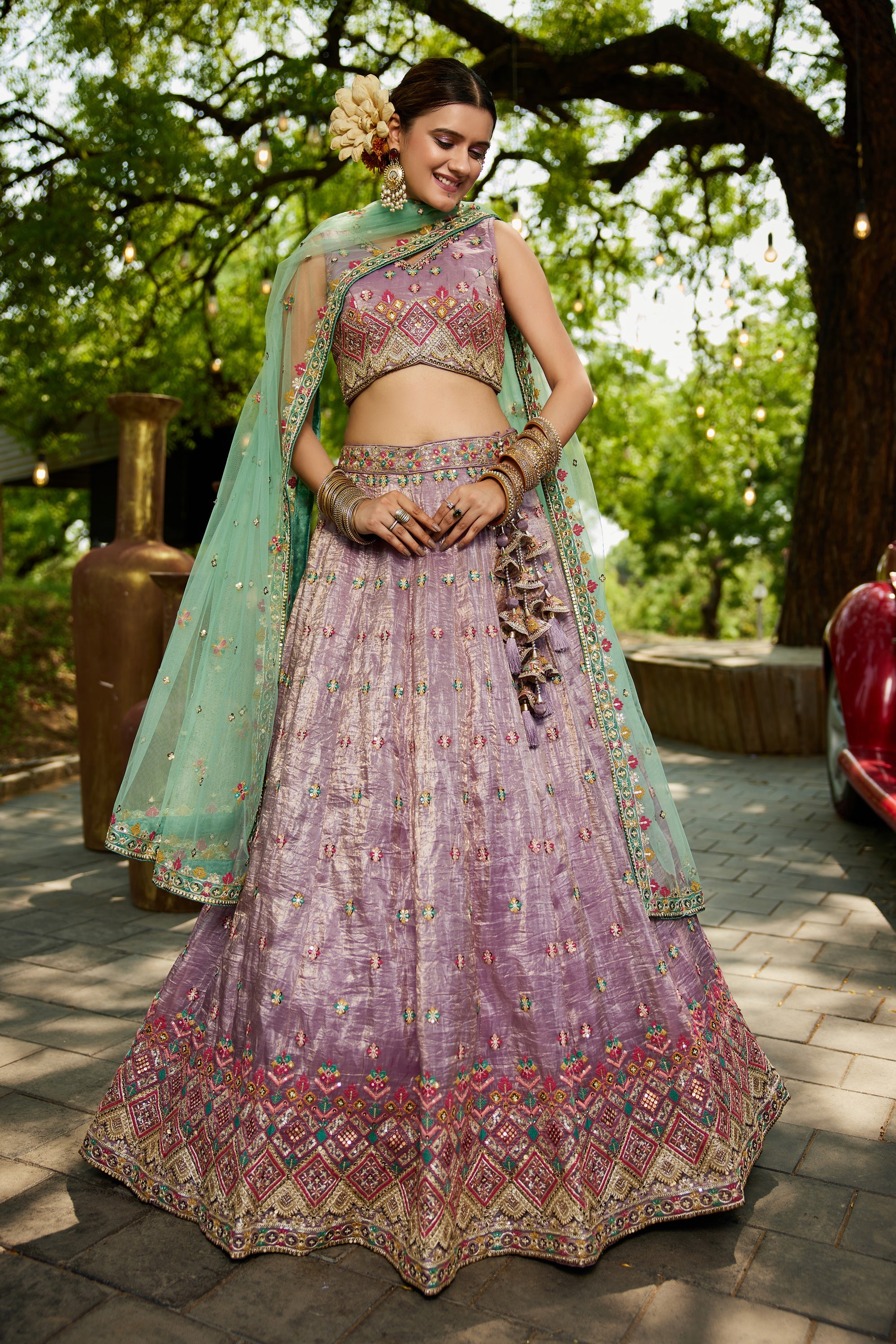 Heavy Embroidered Lavender Bridal Lehenga Choli In Tissue Fabric