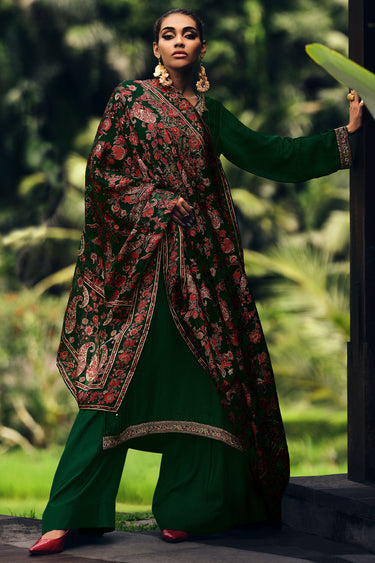 Heritage Dark Green Embroidered Pakistani Suit In Muslin Silk Fabric
