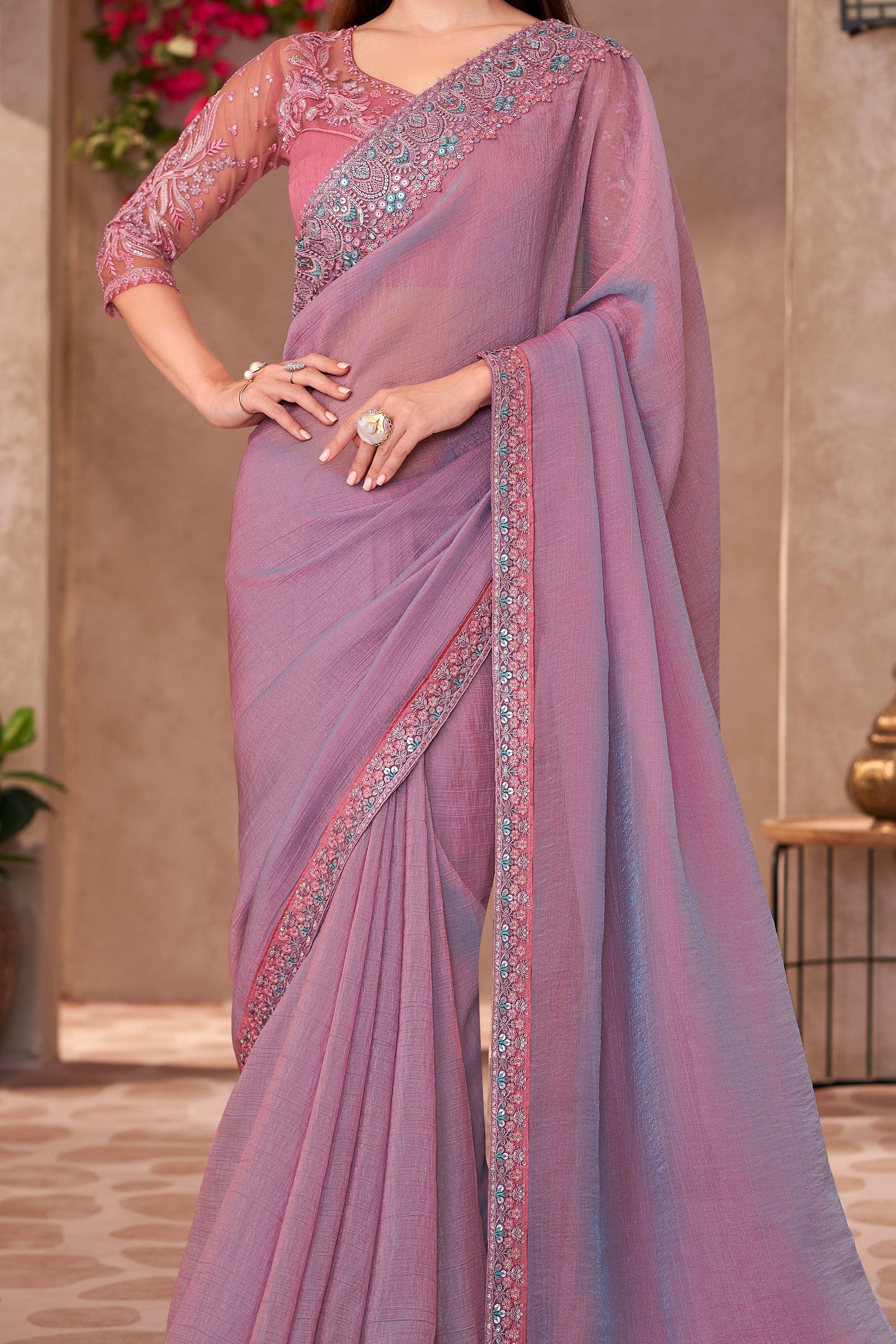 Incredible Border Work On Georgette Fabric Lavender Color Saree