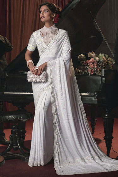 Incredible Heavy Embroidery Work Net White Color Saree With Party Look Blouse