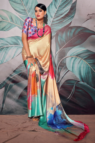 Ingenious Digital Printed Cream Color Satin Fabric Saree