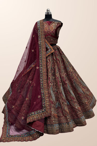 Elevate your bridal look with our exquisite Bridal Lehenga, crafted from luxurious velvet fabric and adorned with shimmering sequins work. This stunning ensemble features a full-flared skirt and a double dupatta, offering versatile styling options for a regal touch.