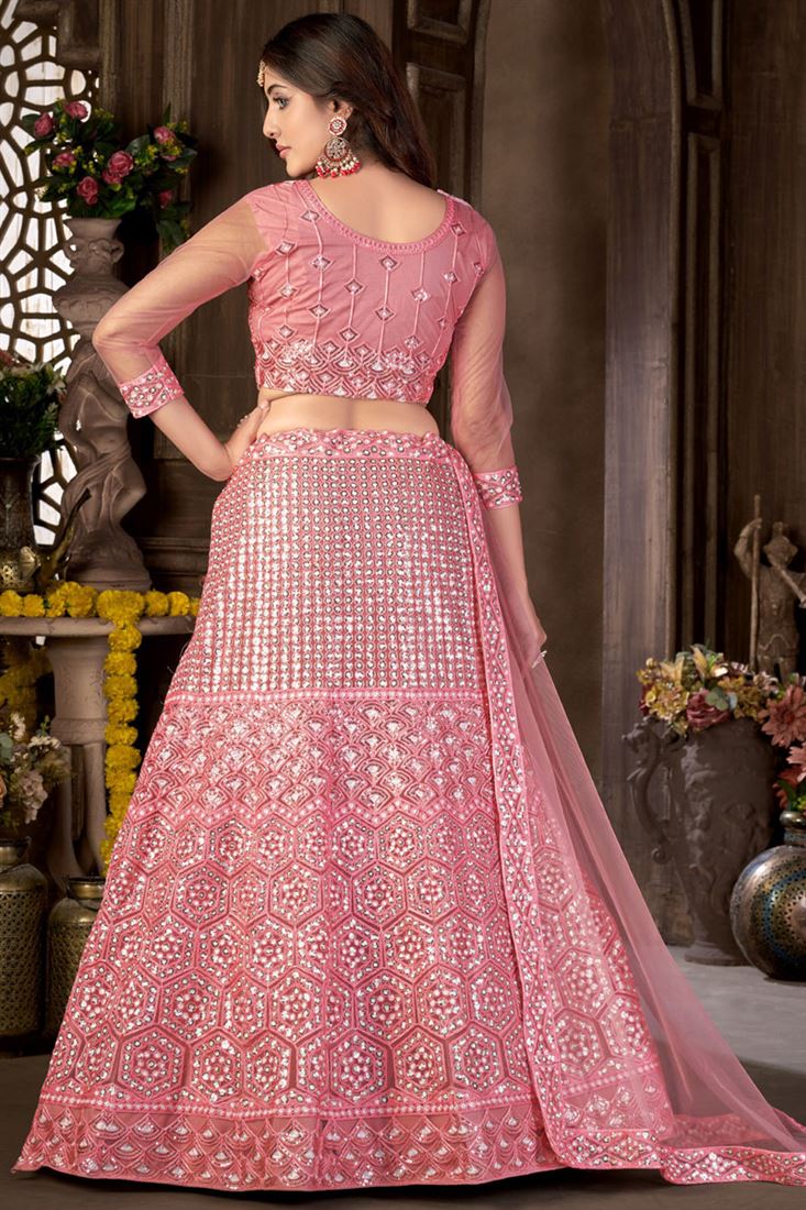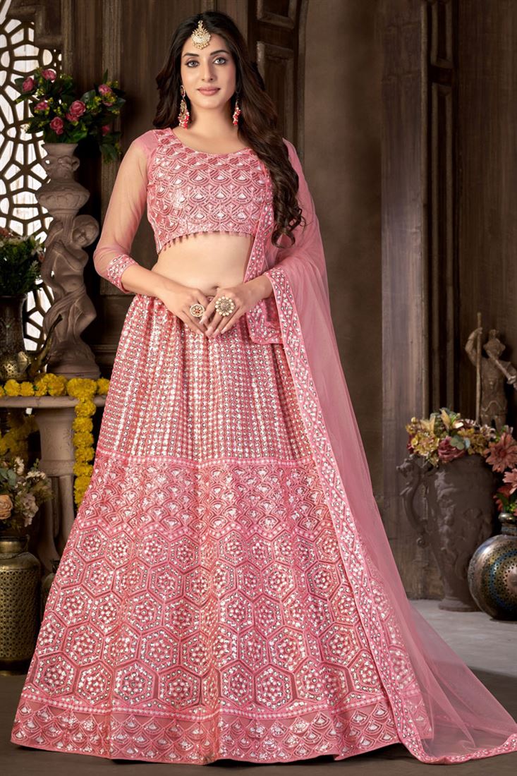 Ingenious Sequins Work On Pink Color Lehenga In Net Fabric