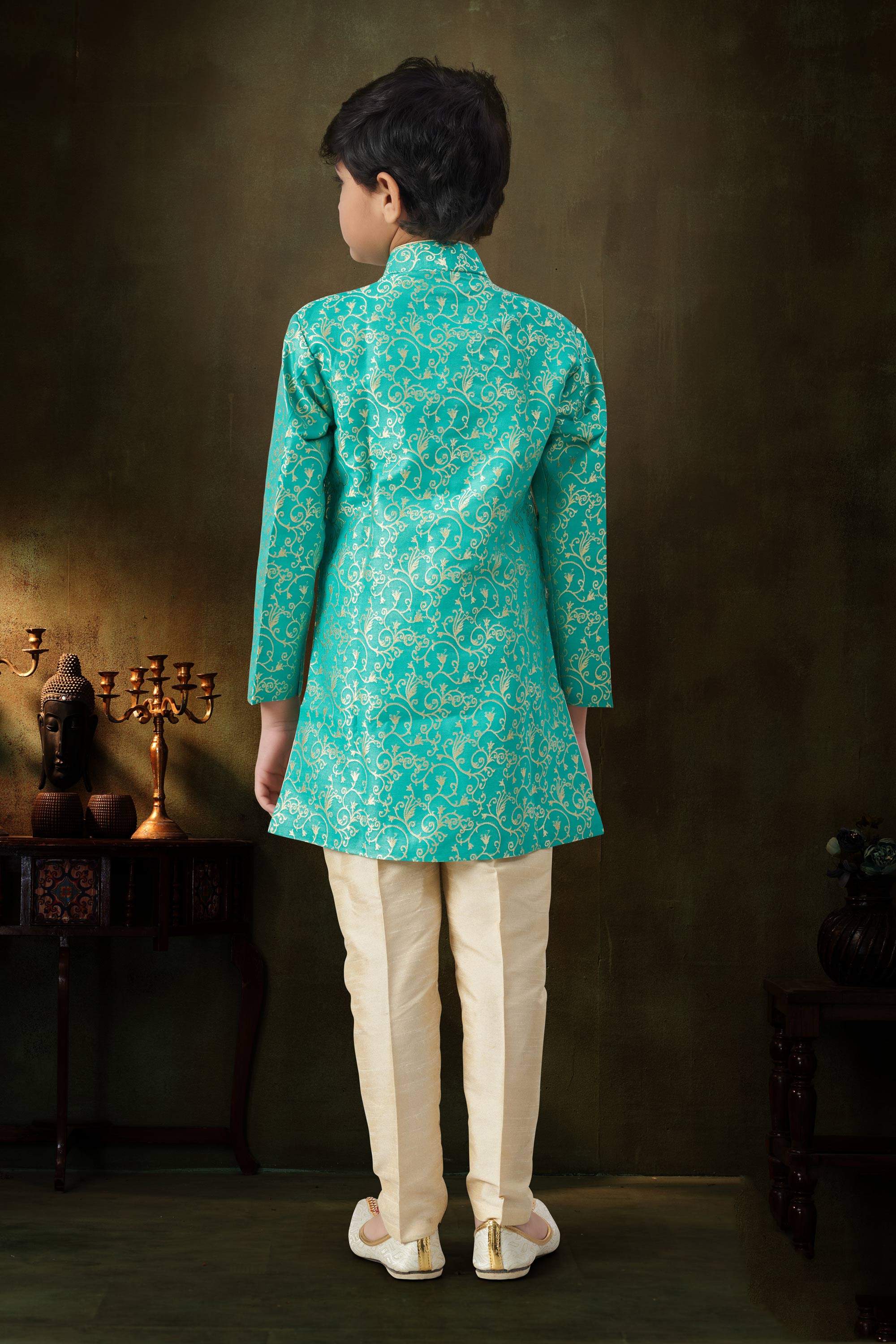 Give your little prince a royal festive look with this stylish Boys Indo Western Readymade Outfit, designed to blend traditional charm with a modern silhouette. Crafted from premium Jacquard fabric, the Indo Western top offers a rich texture and graceful appeal, making it perfect for festivals and special occasions. Due to digital photography, slight color variations may occur.