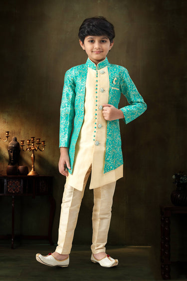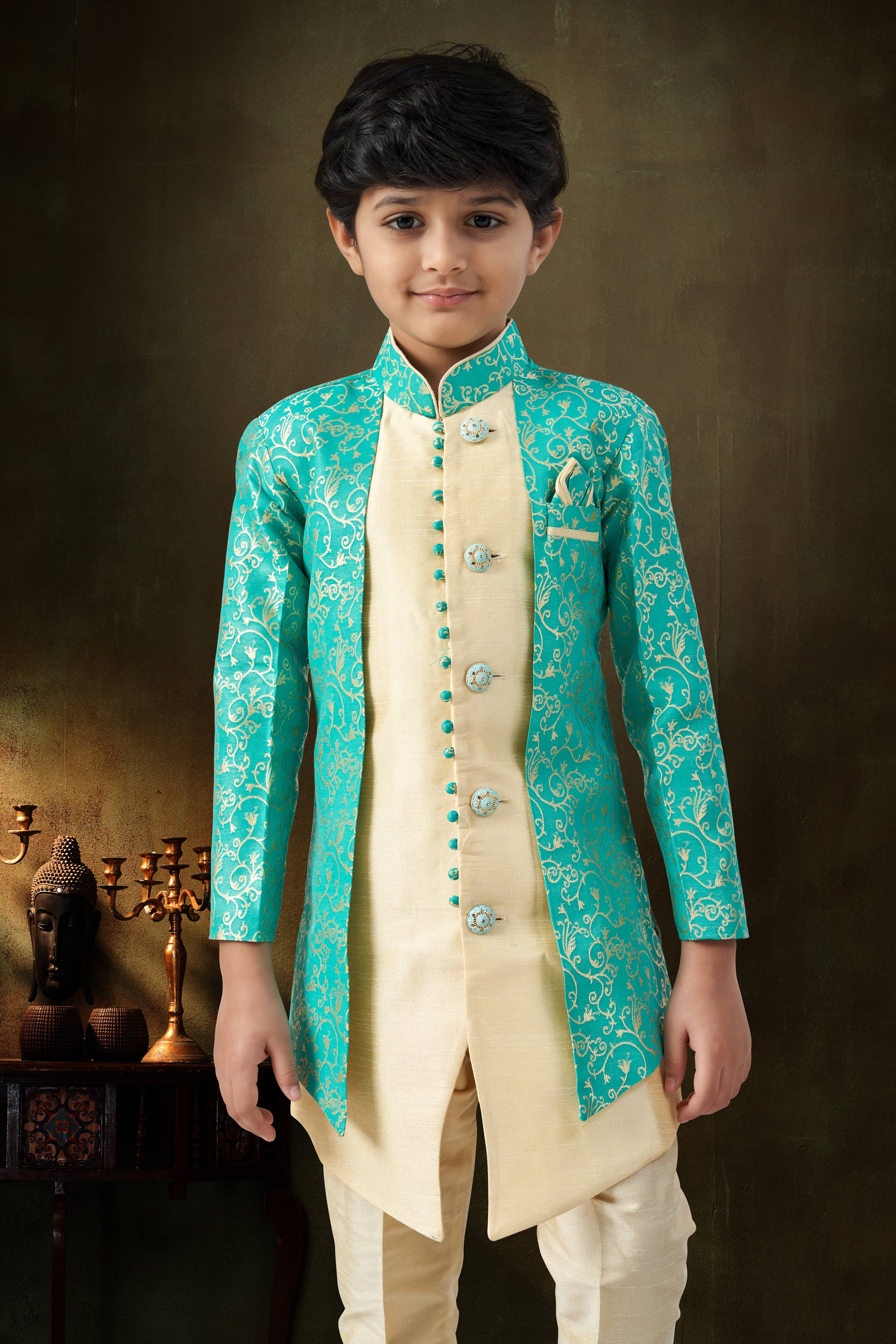 Jacquard Fabric Beige Boys Readymade Indo Western For Festive Wear