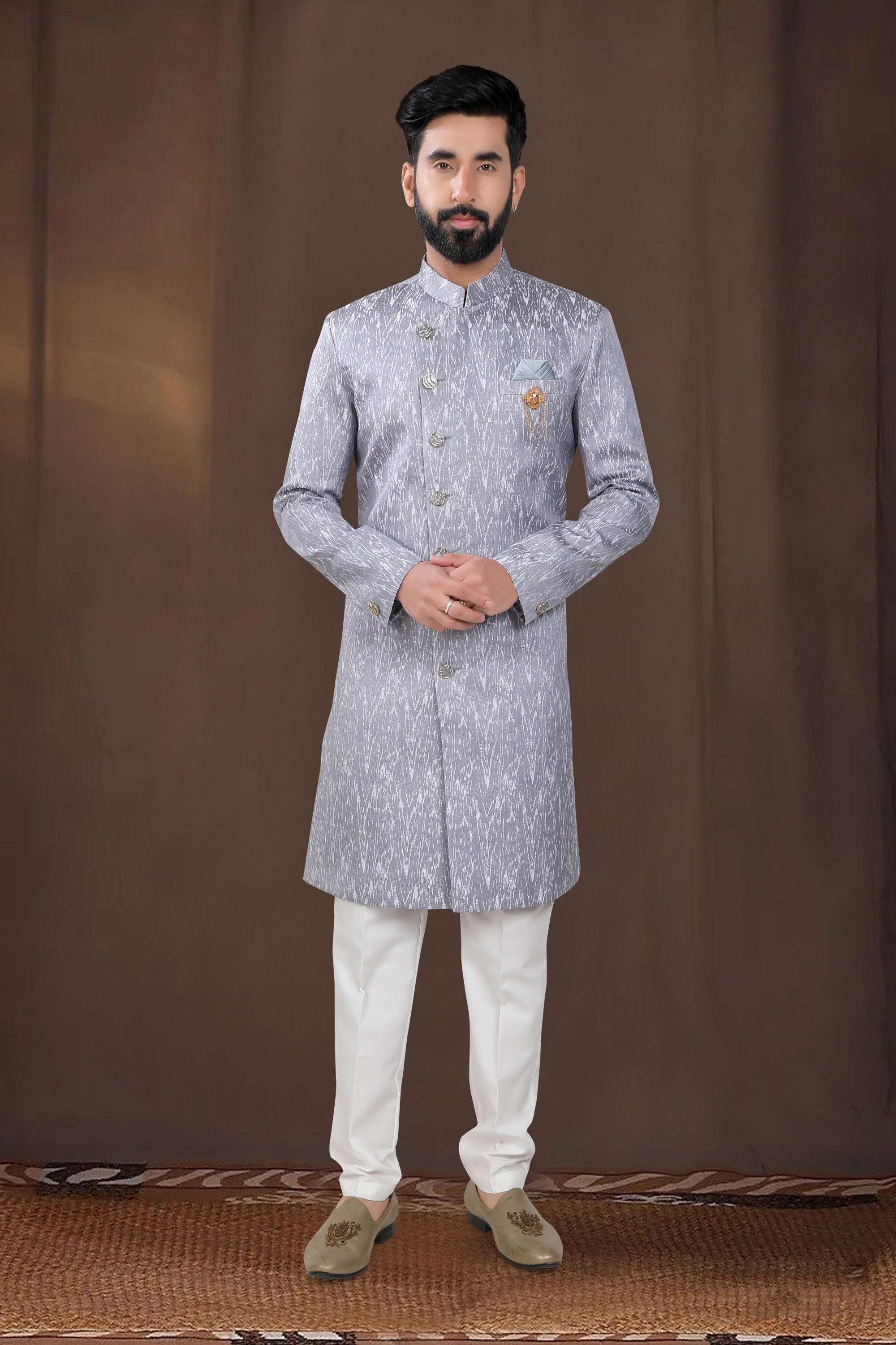 Jacquard Grey Wedding Wear Readymade Designer Men Indo Western