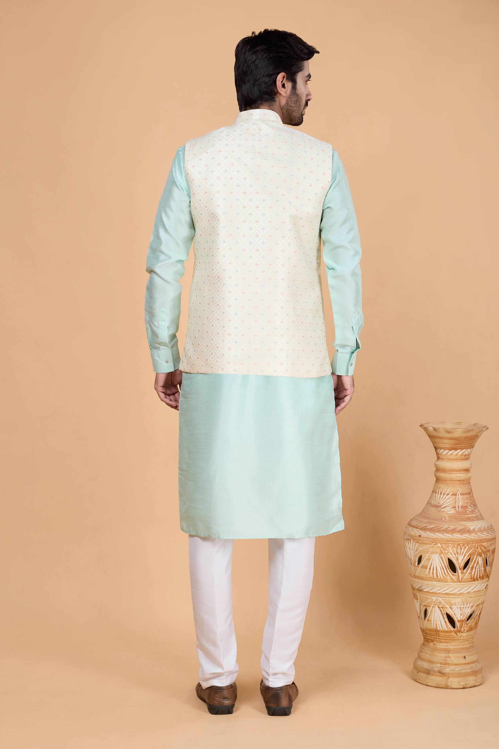 Jacquard Silk Sea Green Men Readymade Kurta And Aligadhi Pant For Wedding Wear