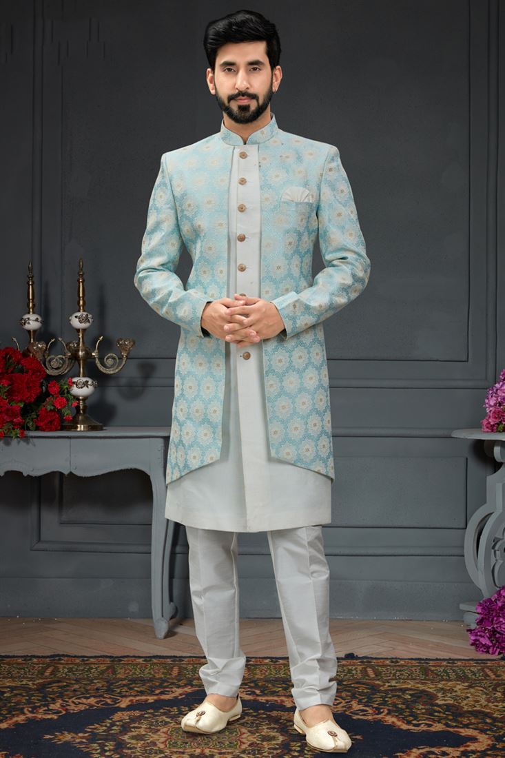 Jacquard Wedding Wear Attractive Readymade Men Indo Western In Sky Blue Color