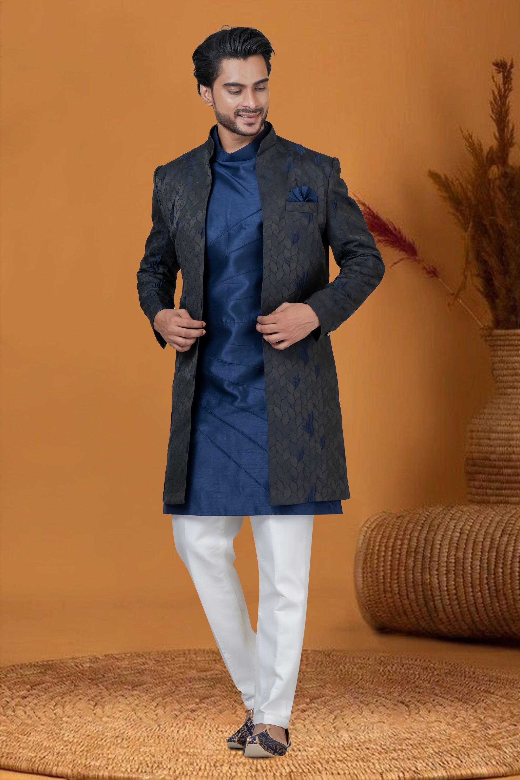 Jacquard Work Fancy Navy Blue Color Jacquard Silk Fabric Wedding Wear Readymade Indo Western For Men