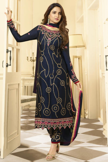 Jasmin Bhasin Satin Georgette Navy Blue Color Creative Salwar Suit