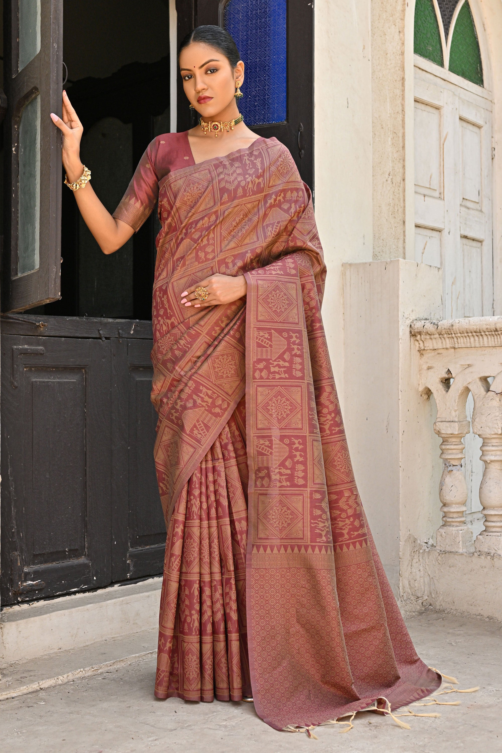 Kalamkari Weaving Work Handloom Raw Silk Brown Designer Saree With Gorgeous Blouse