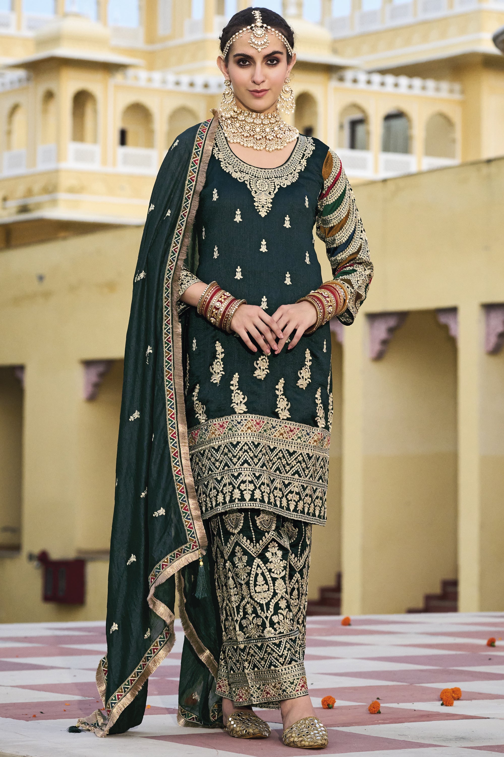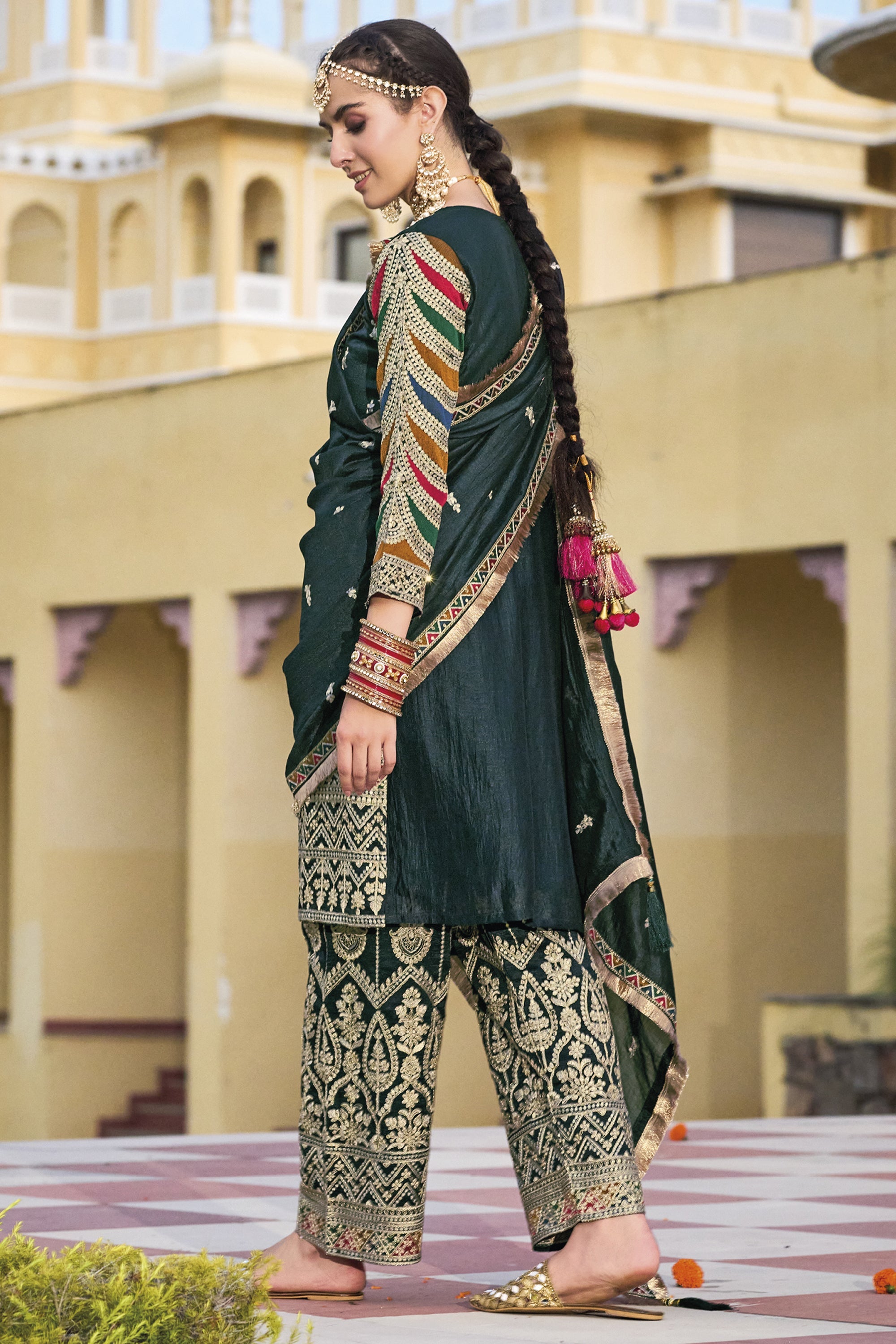 Karva Chauth Special Embroidered Art Silk Fabric Dark Green Color Readymade Punjabi Style Palazzo Salwar Kameez