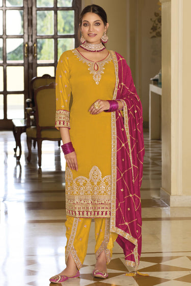 Karva Chauth Special Embroidered Yellow Color Readymade Designer Salwar Suit In Art Silk Fabric