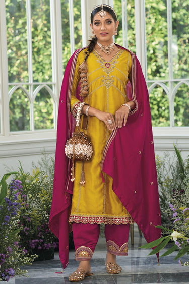 Karva Chauth Special Embroidery Work Yellow Color Art Silk Fabric Stylish Readymade Suit