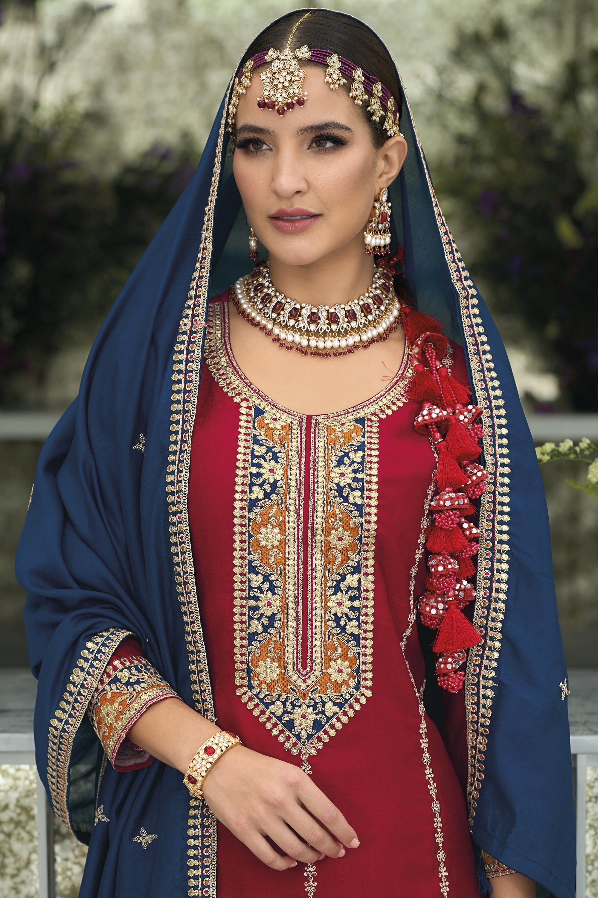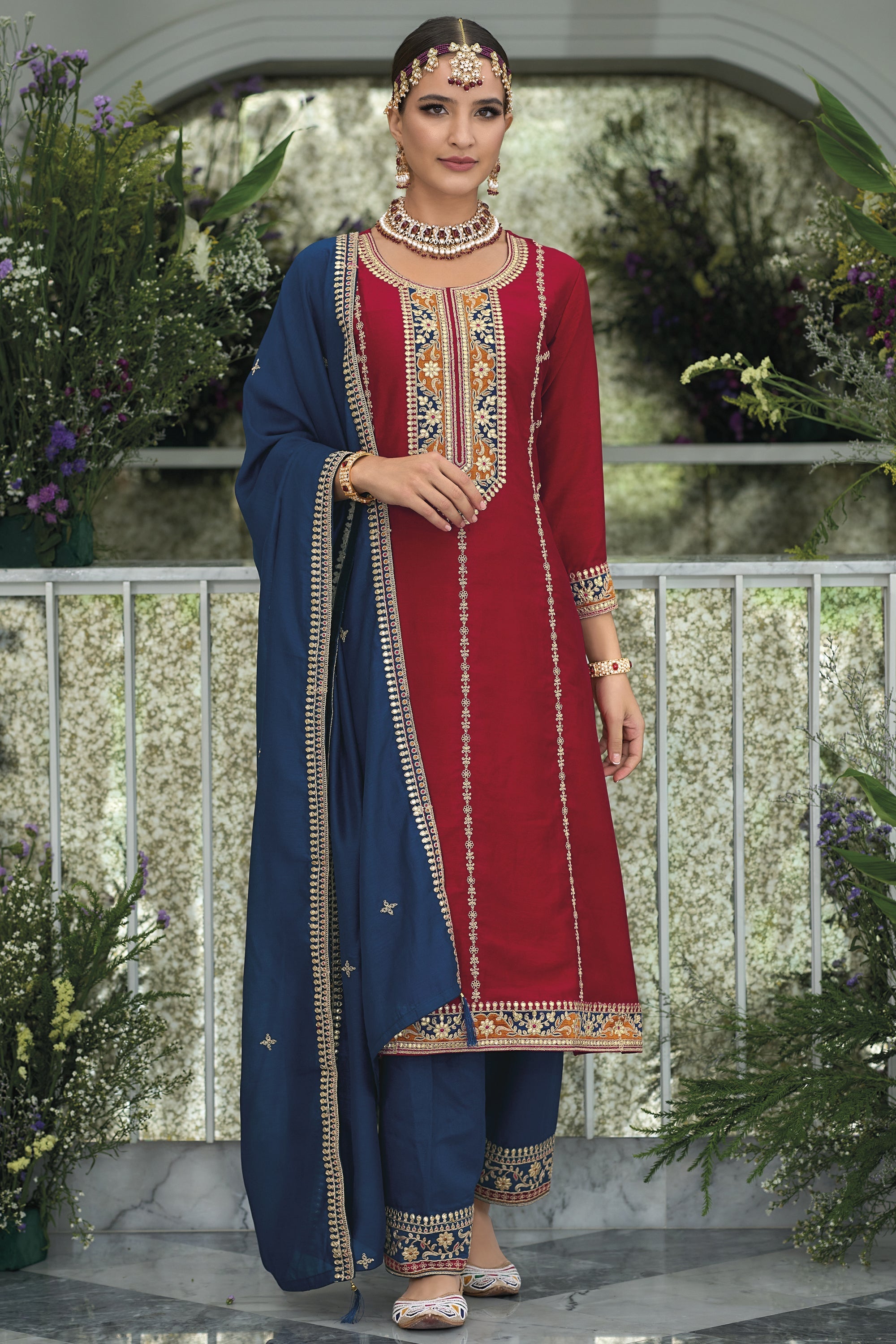 Karva Chauth Special Fantastic Red Color Art Silk Fabric Embroidery Work Readymade Salwar Kameez