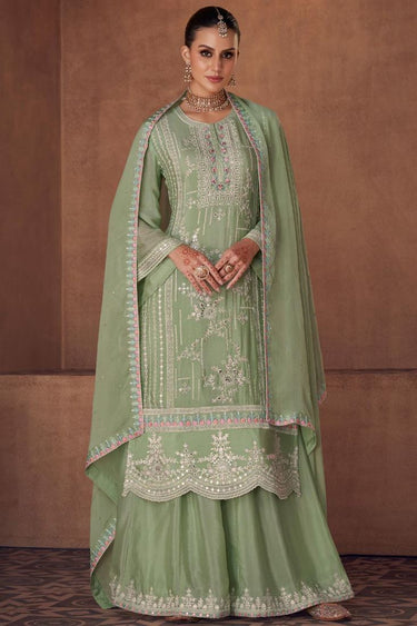 Khaki Color Georgette And Chinon Embroidered Palazzo Suit In Function Wear