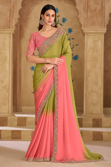 Lace Border Work Georgette Green Designer Saree For Festive Wear