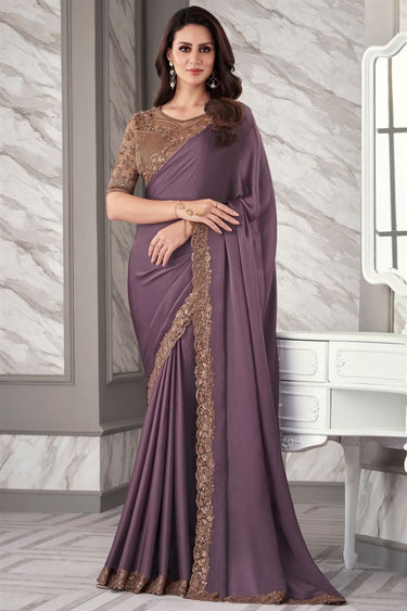 Larissa Bonesi Glamorous Border Work Satin Silk Fabric Lavender Color Saree