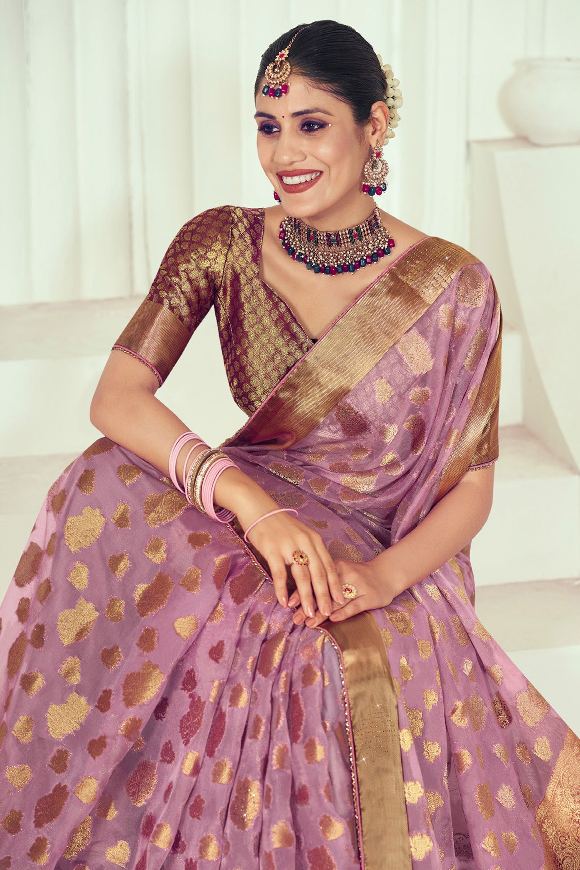 Step into a world of glamour with our designer Organza saree, available in an elegant shade of pink. Perfectly sized at 6.30 meters, this saree blends design and comfort seamlessly. Dazzling with woven and stone work, border tassals and a rich pallu, it also comes with brocade blouse material. Suitable for parties, functions, weddings or festivals, this saree is a simple choice with an effortless charm. Easy to maintain with only a normal or hand wash needed.