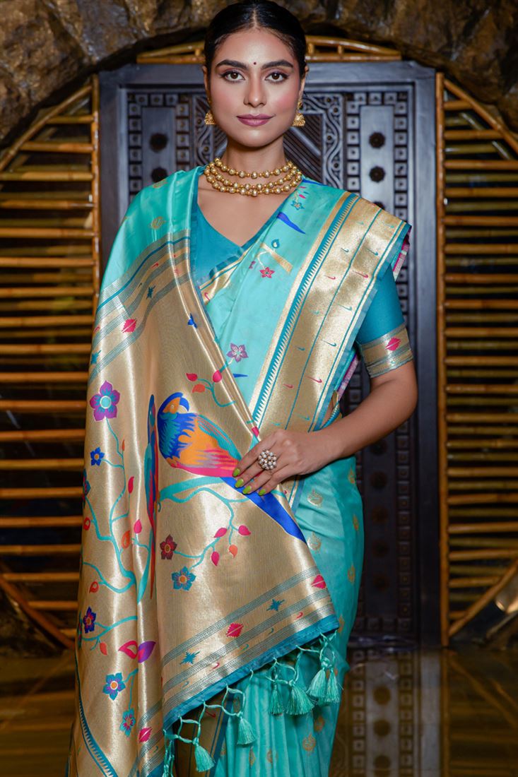 Introducing our exquisite and captivating Light Cyan Paithani Silk Saree, meticulously crafted to elevate your style and grace.