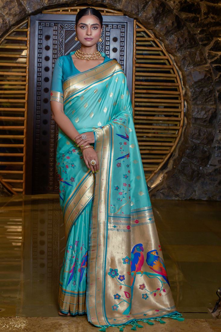 Light Cyan Color Ingenious Paithani Silk Weaving Work Saree