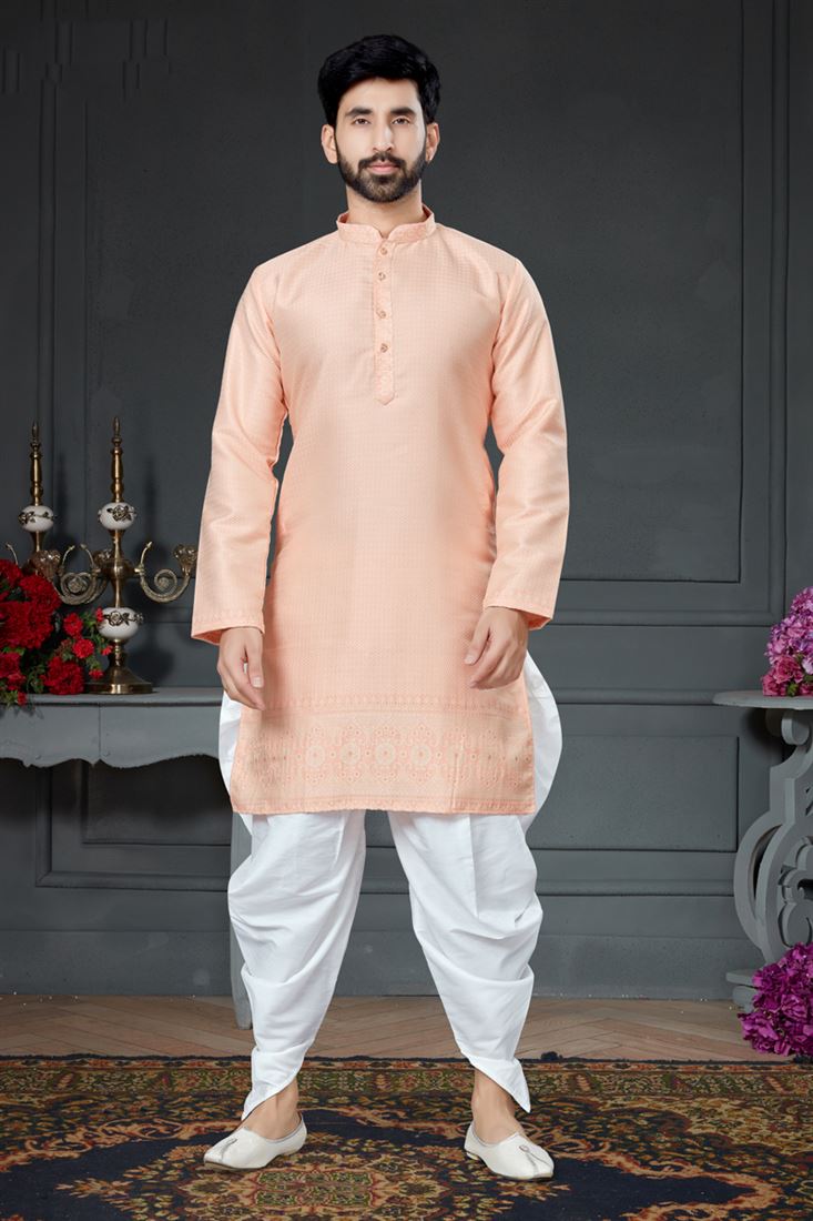 Lovely Peach Color Festive Wear Dhoti Style Kurta Pyjama For Men