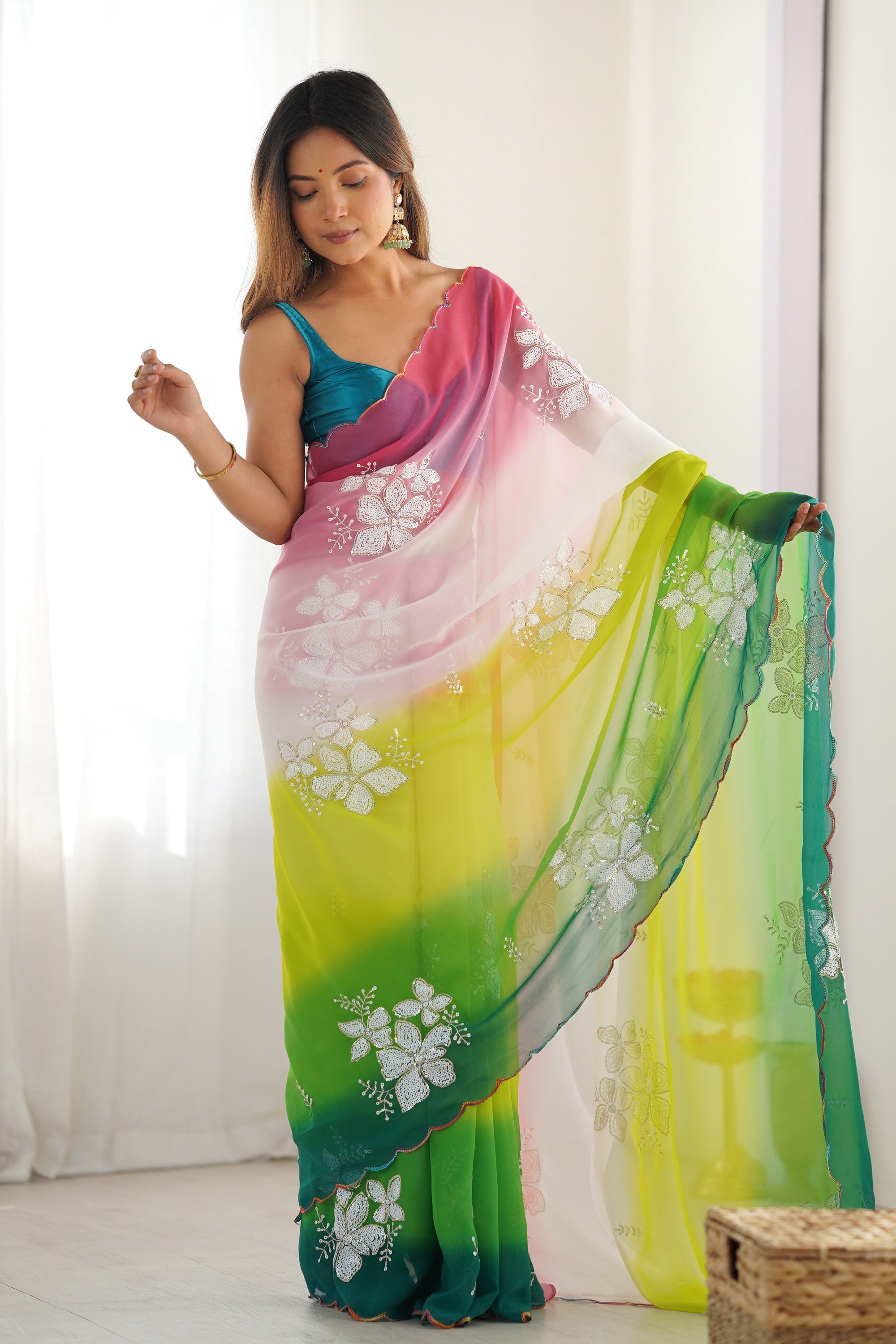 Step out in style with the Reach Color Sequins Work Georgette Casual Saree with Blouse! This saree features stunning sequins work on a premium quality georgette fabric, making it a must-have for your casual wardrobe. The fabric's lightness ensures all-day comfort while the sequins add a touch of glam to your everyday look. Accompanied by a matching blouse piece, you can tailor it to your desired fit. Perfect for brunches, day parties, and more, this saree offers a blend of elegance and simplicity that enhances your natural beauty effortlessly.