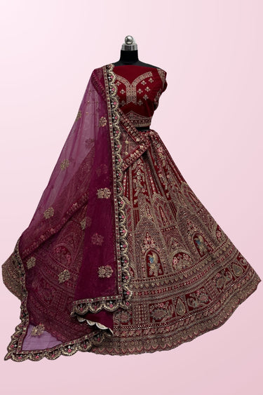 Magnificent Bridal Velvet Lehenga With Double Dupatta In Rani Color