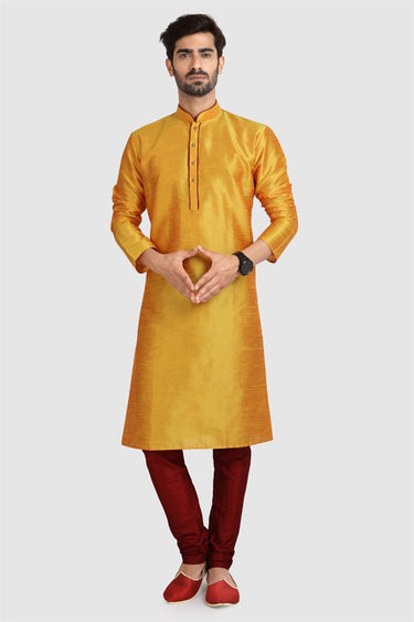 Magnificent Golden Color Art Silk Fabric Readymade Kurta Pyjama For Men