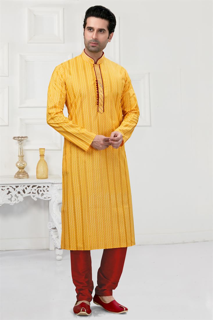 Magnificent Yellow Color Cotton Fabric Reception Wear Fancy Printed Readymade Kurta Pyjama For Men