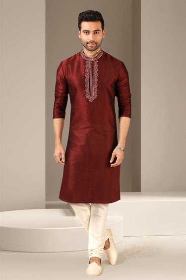 Maroon Color Banarasi Art Silk Fabric Sangeet Wear Trendy Readymade Kurta Pyjama For Men
