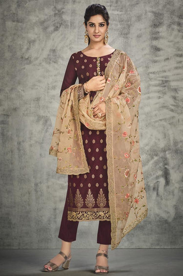 Maroon Color Beguiling Jacquard Silk Salwar Suit In Party Wear