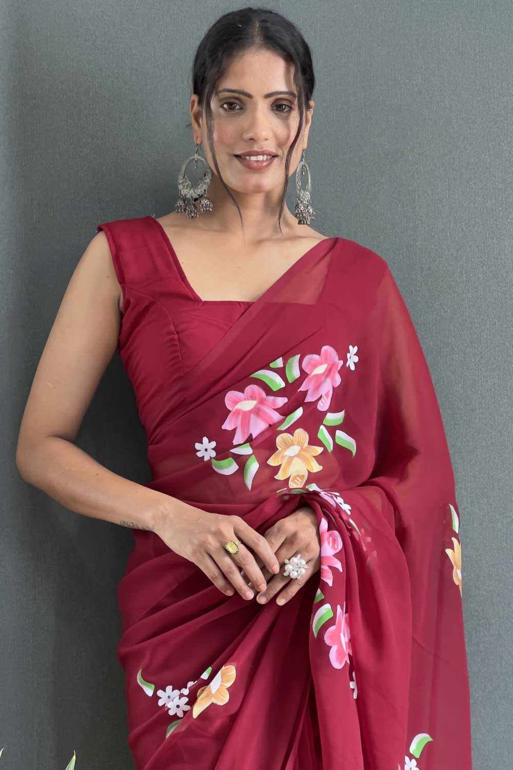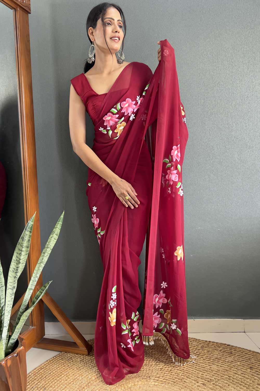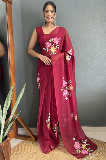 Maroon Color Fantastic Georgette Floral Printed Saree
