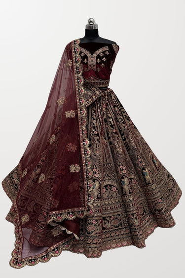 Maroon Color Fashionable Bridal Velvet Lehenga With Double Dupatta