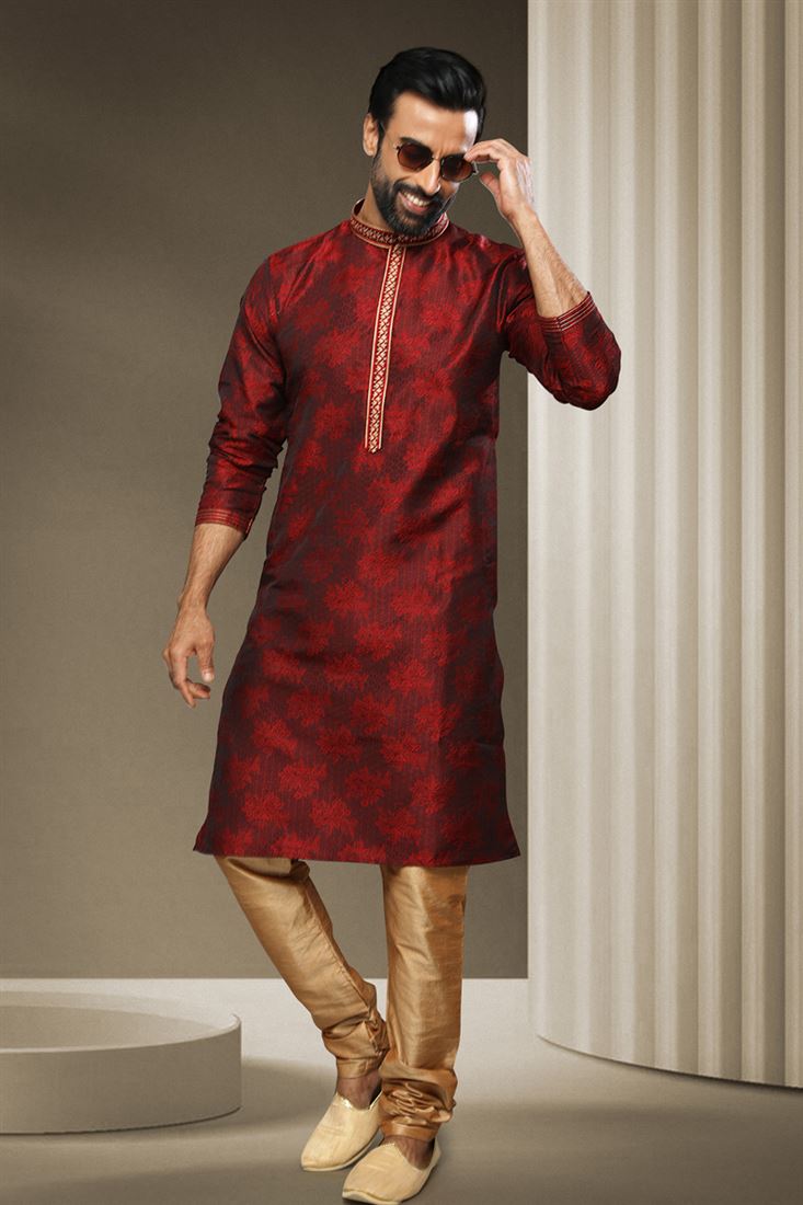 Maroon Color Jacquard Silk Fabric Sangeet Wear Readymade Kurta Pyjama For Men