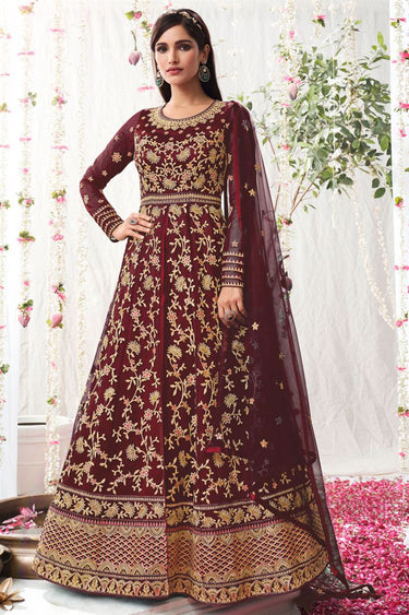 Maroon Color Sangeet Wear Net Fabric Extravagant Vartika Singh Anarkali Suit