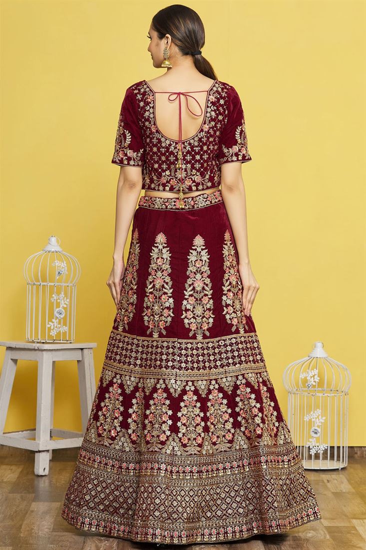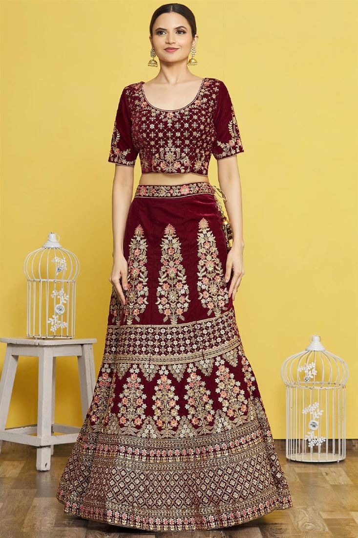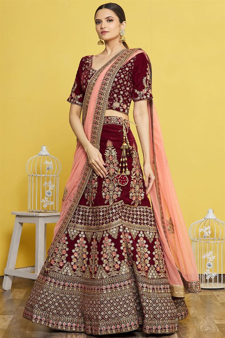 Maroon Color Velvet Fabric Charismatic Embroidered Bridal Lehenga
