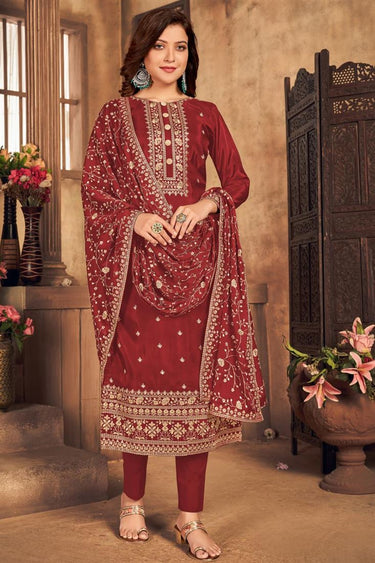 Maroon Festive Wear Viscose Fabric Embroidered Straight Cut Dress