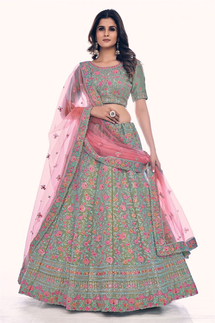 Marvellous Net Fabric Sequins Work Lehenga Choli In Olive Color