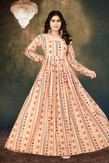 Maslin Fabric Digital Printed Luminous Readymade Gown In Cream Color